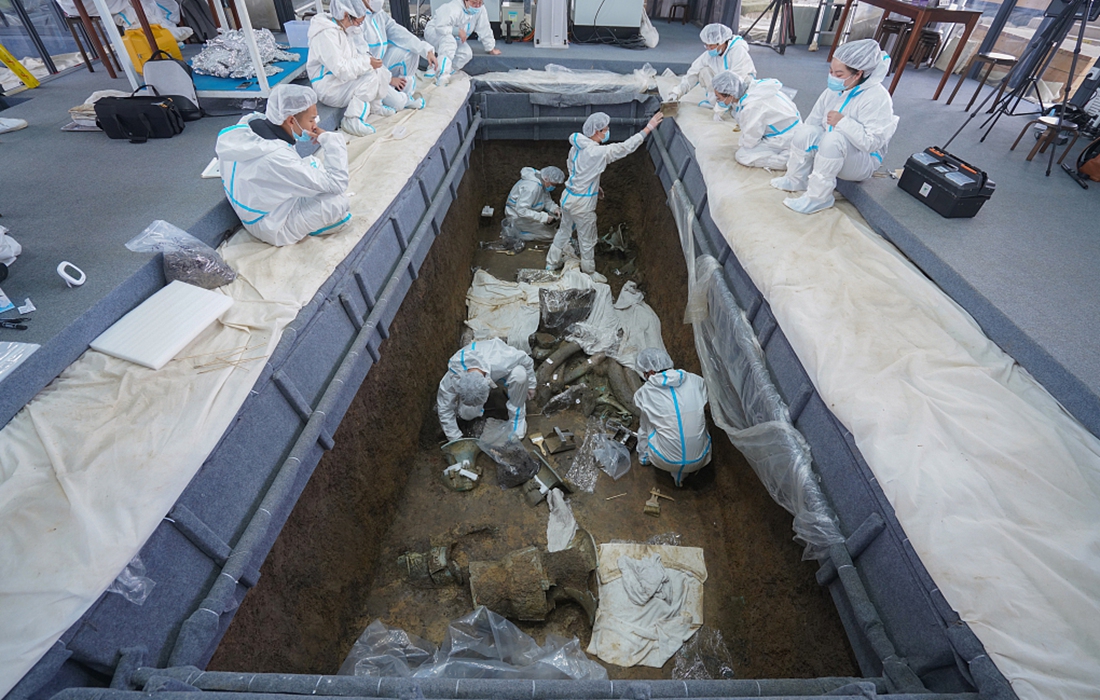 Chinese archaeologists announced new findings from the 3,000-year-old Sanxingdui Ruins on Saturday, unearthing more than 500 items, including a golden mask, from 6 newly-discovered sacrificial pits.