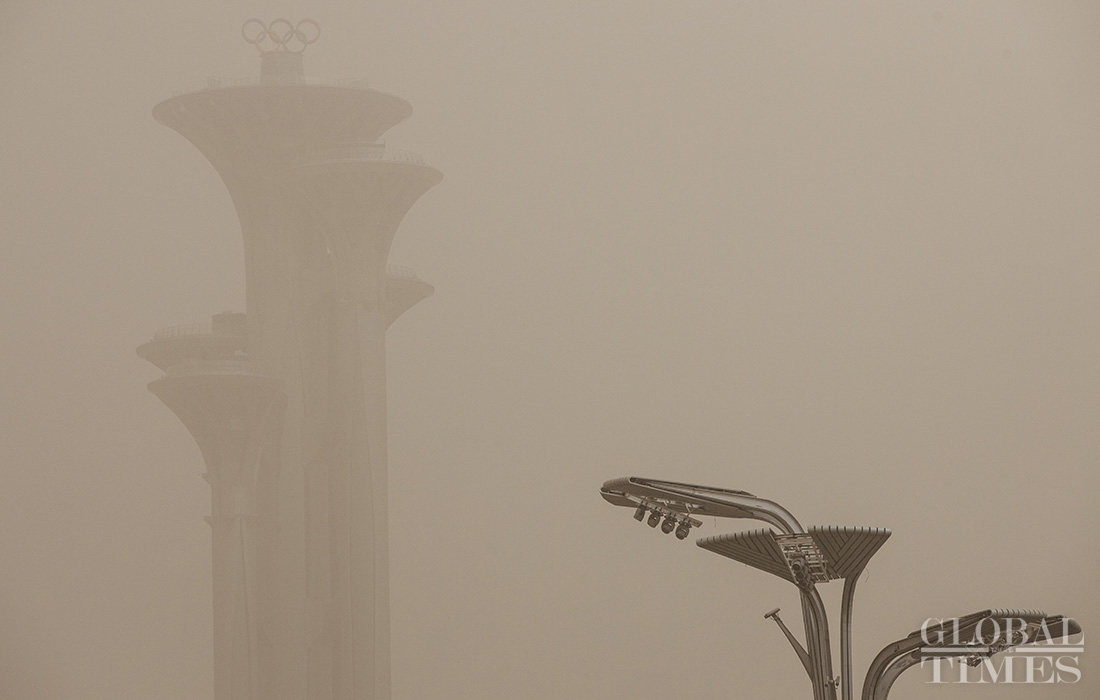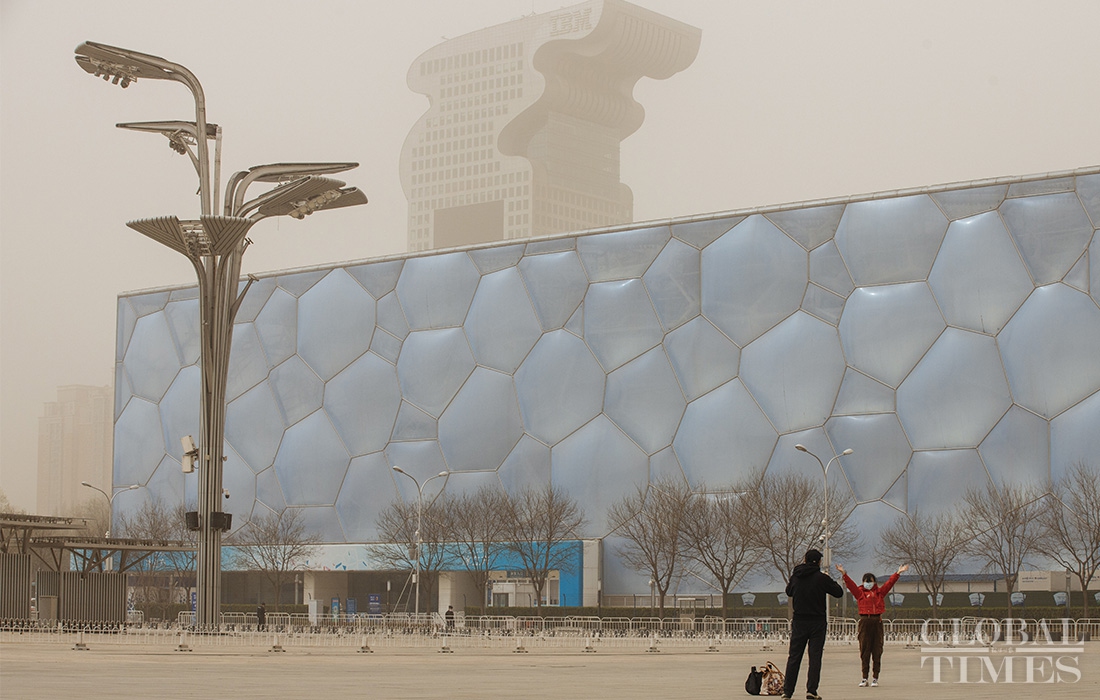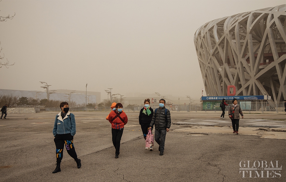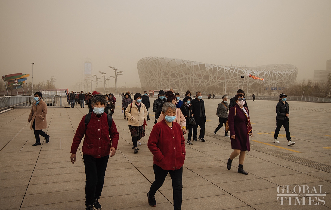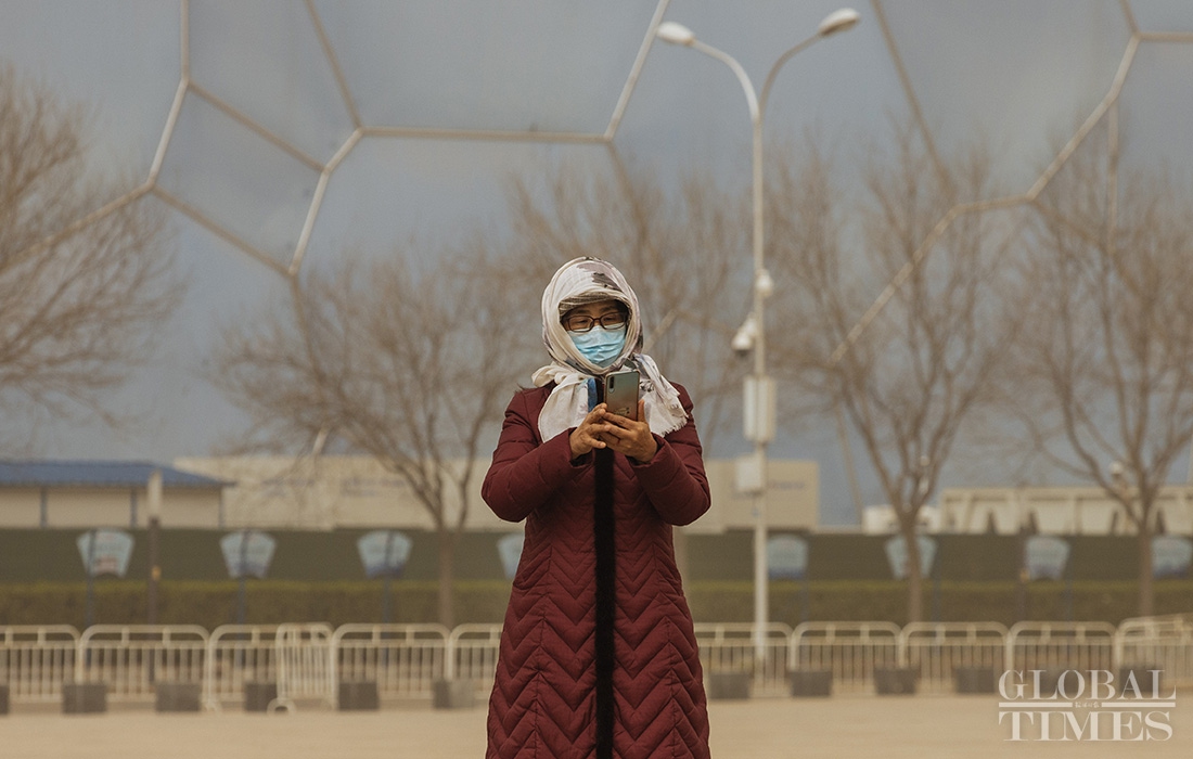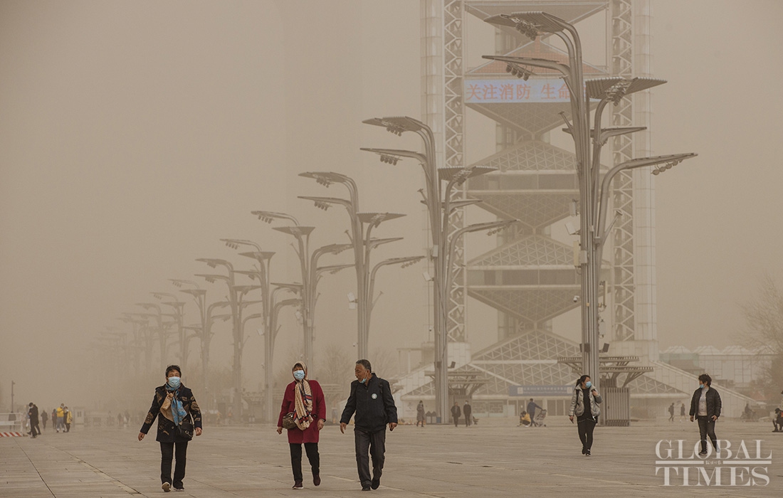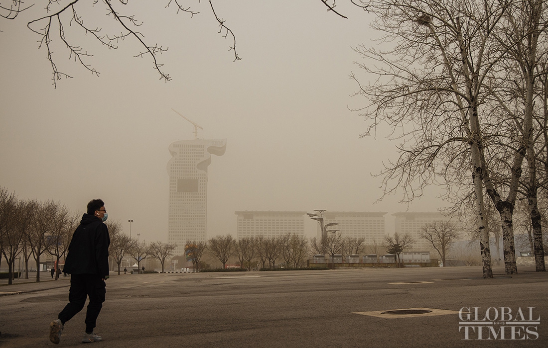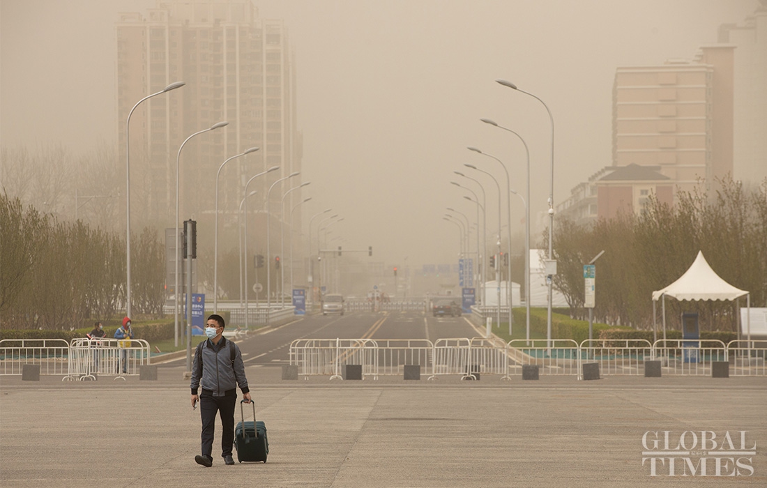 This is the second time in 13 days a sandstorm has blanketed Beijing. The dust weather is expected to gradually abate and air quality will improve after nightfall today. Photos: Li Hao/GT