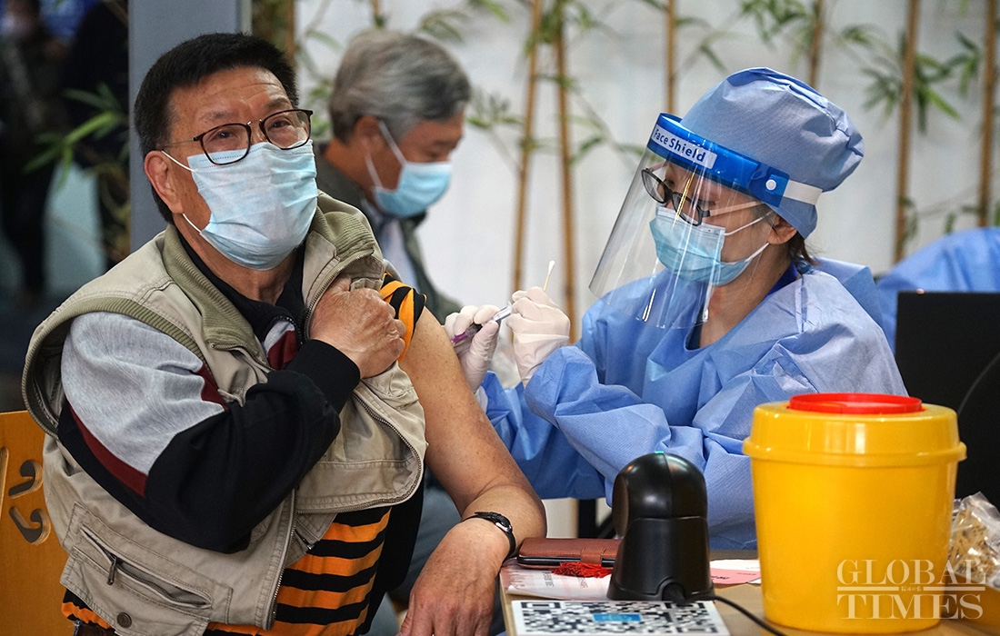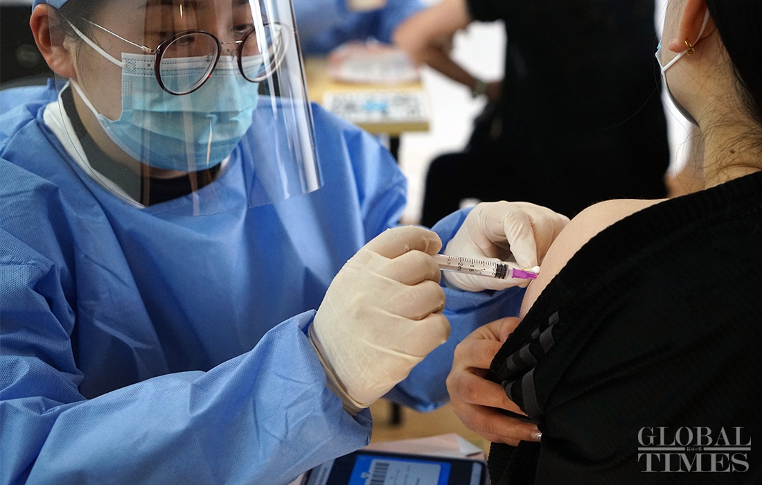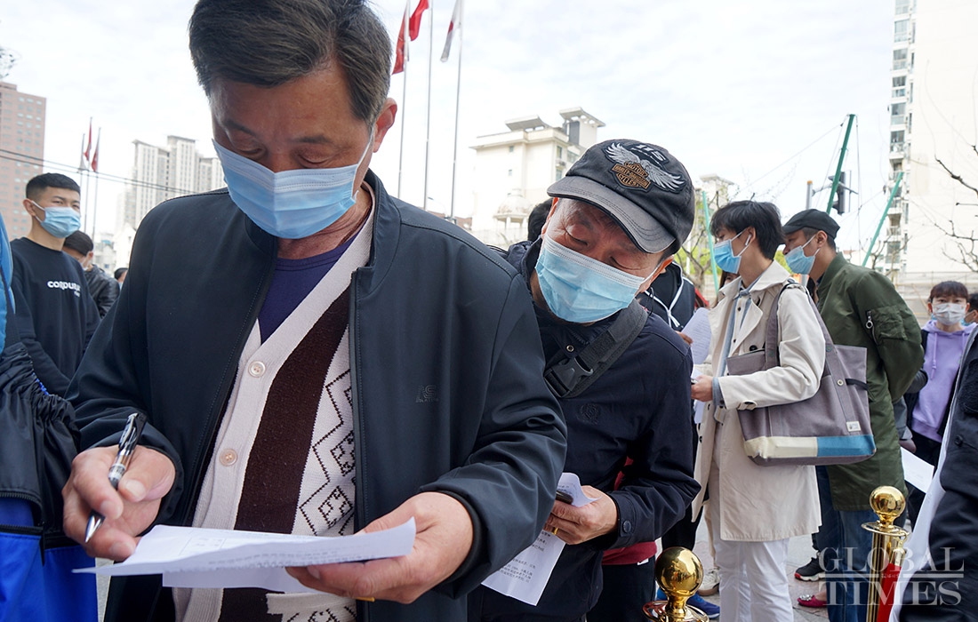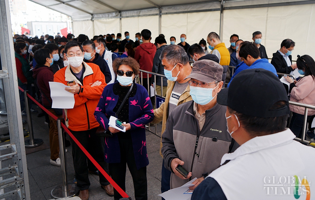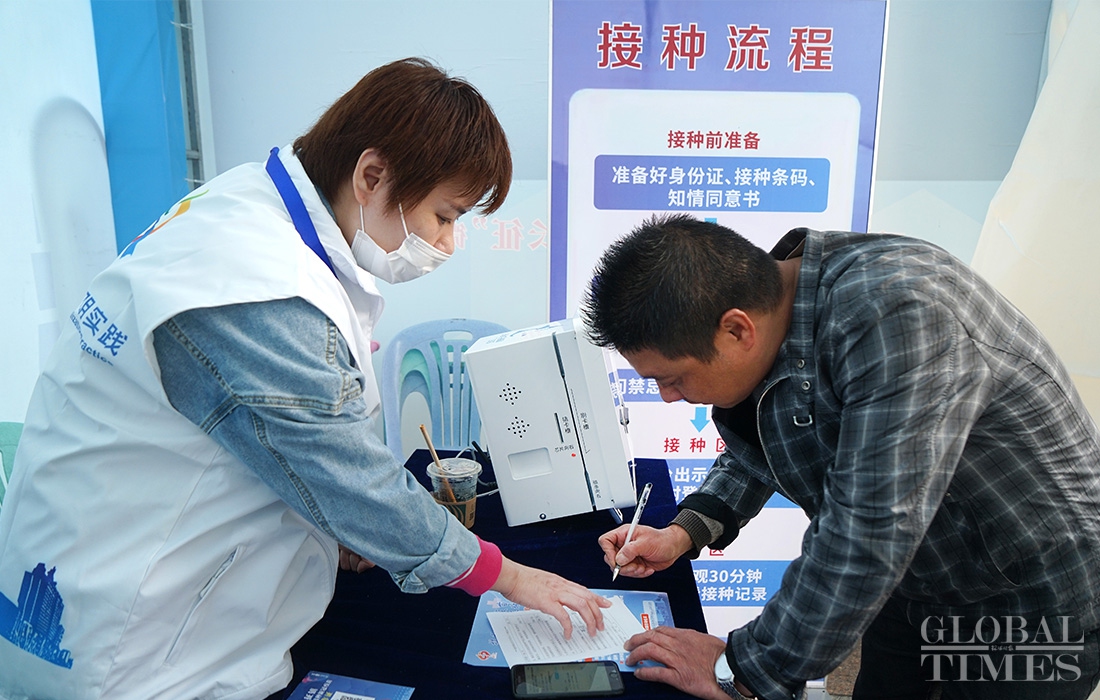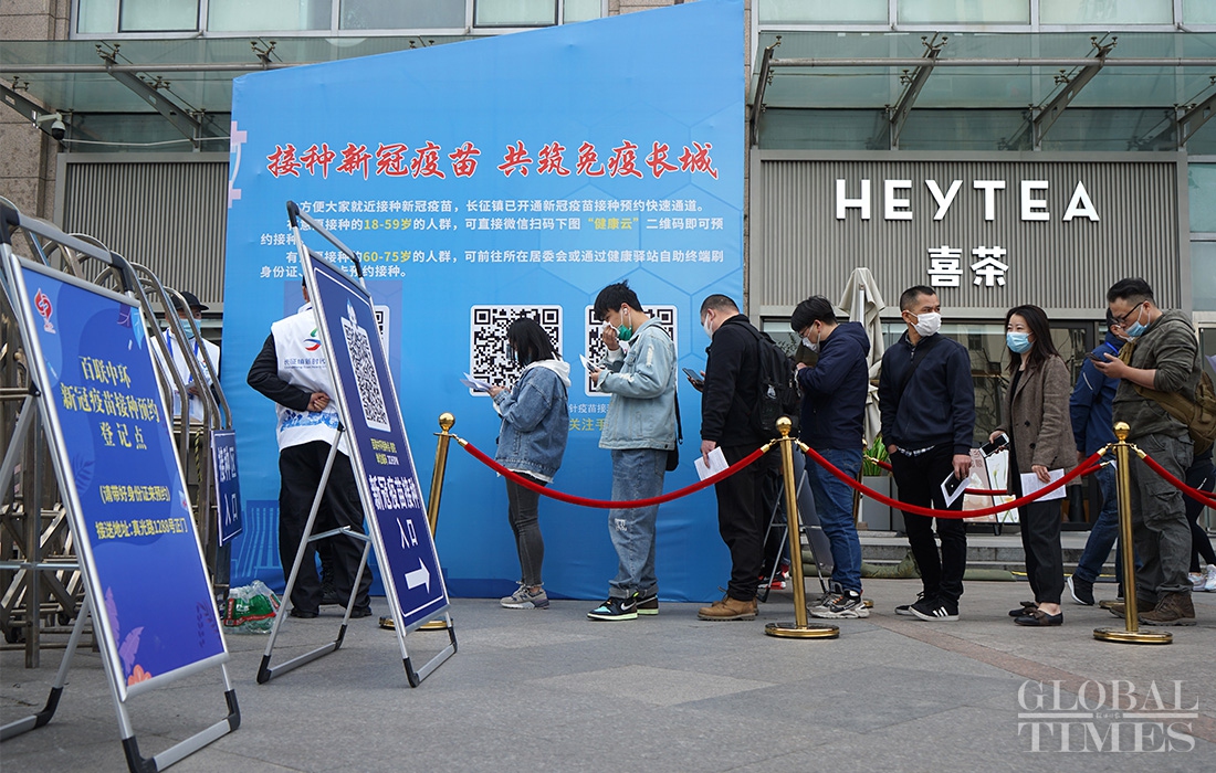 Residents in Shanghai lined up for COVID-19 vaccines Tuesday morning at a temporary site set up near a commercial area in Putuo district. The local health commission had sent a medical team to provide COVID-19 vaccination services to employees who work in the Central Bailian commercial cycle or nearby industrial parks, as well as to citizens that came to shop in the region. The site has six inoculation tables. Medical staff work from 8:30 am to 17:00 pm each day, with about 1000-1200 shots administered on average each day.