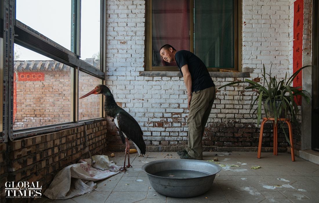 A member of the protection team observes a black stork. Nowadays, many locals will contact the protection team when they find injured wild animals and the team will take them to the rescue center for treatment and later release. Photo: Li Hao/GT figcaption >