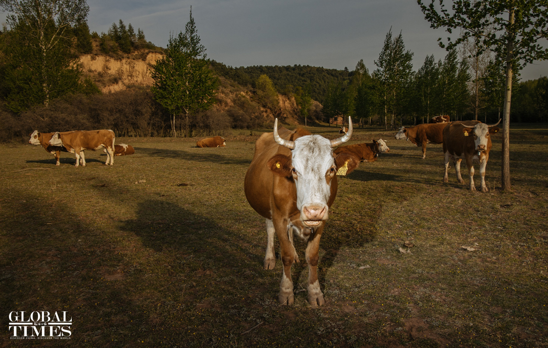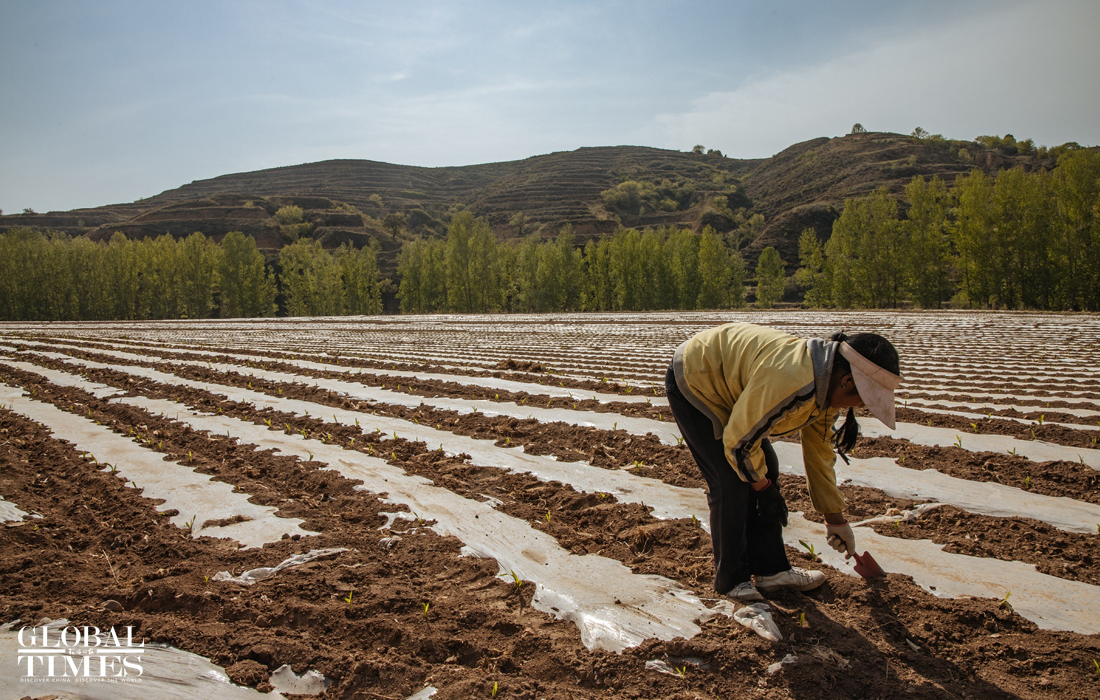 A local woman loosens the soil behind the mountains. Due to the gentle mountain terrain, the forests of Heshun county are relatively easy to access. This is the favorite habitat of the North China leopards which also makes local poaching prevention more difficult. Photo: Li Hao/GT figcaption >