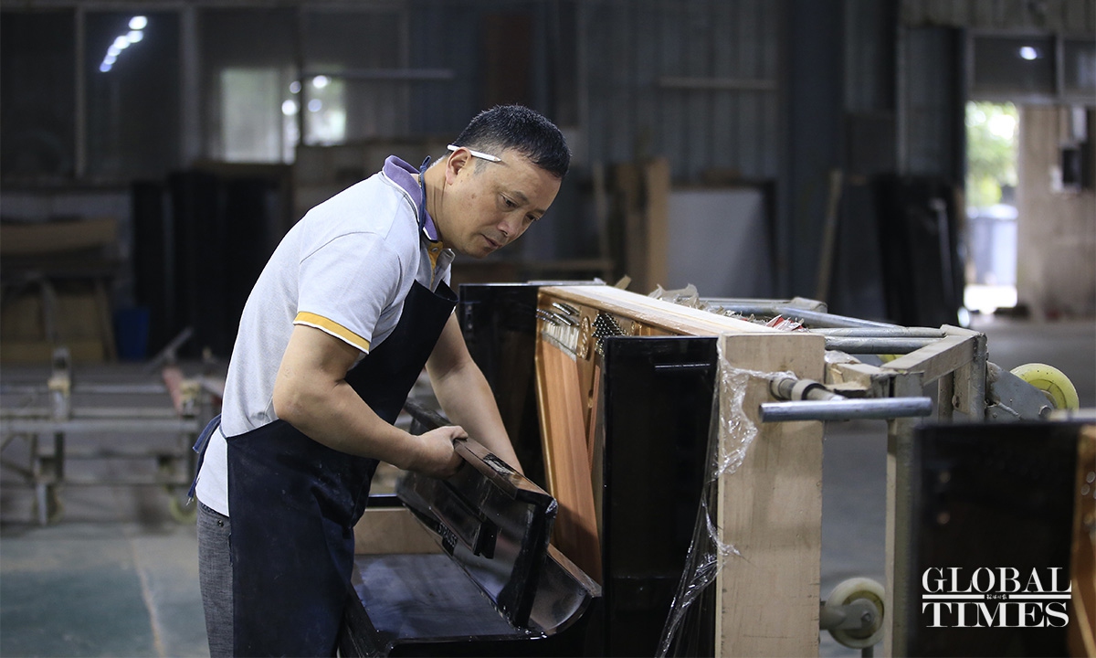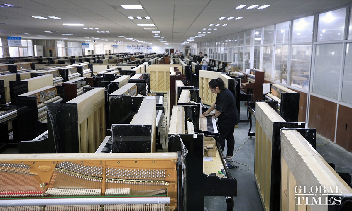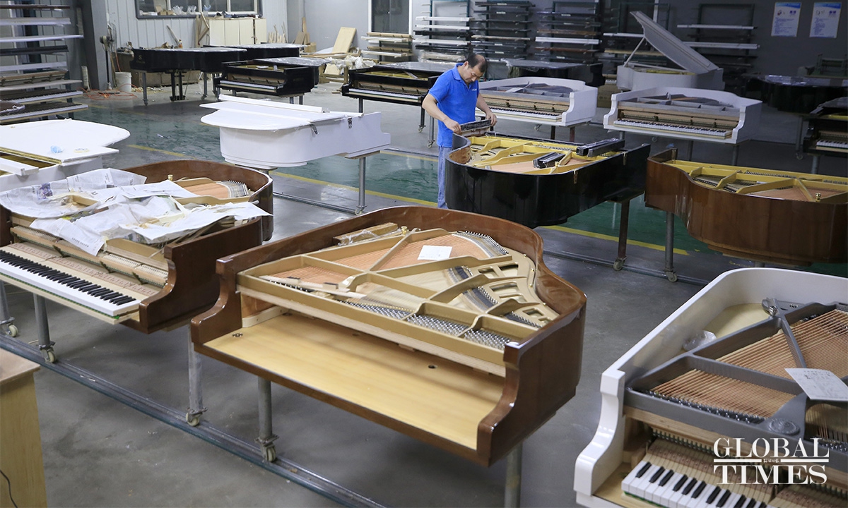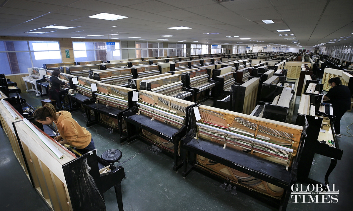 Luoshe town, in Deqing, East China’s Zhejiang Province produces 1/7 of pianos in China. At present there are nearly 100 piano manufacturing and accessory enterprises in the town, with a total output value of more than 500 million yuan ($77 million), more than 3,500 piano making professionals. More than 50,000 pianos are made each year and exported to more than 20 countries and regions such as Europe and Southeast Asia.