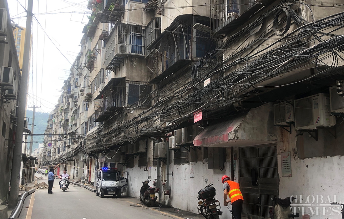 Photos taken near the site of a natural gas explosion that occurred at a market in Shiyan, Central China’s Hubei Province on Sunday morning, which killed 12 and injured 138. Police officers, rescue workers and construction personnel are working hard to clear the debris and confirm if there are more people buried. When the Global Times reporter arrived on Monday afternoon, an ambulance had entered the site. The garden of a house near the collapsed building during the explosion was carpeted with iron plates. Local officials working at the site are registering some residents living nearby who need to go back home to take some articles of daily use. The Shiyan government is still investigating the reasons of the accident and had not released any information on any possible cause. A local resident surnamed Li who used to shop at the market told the Global Times that the accident happened while a maintenance worker was fixing the pipeline following a gas leak.