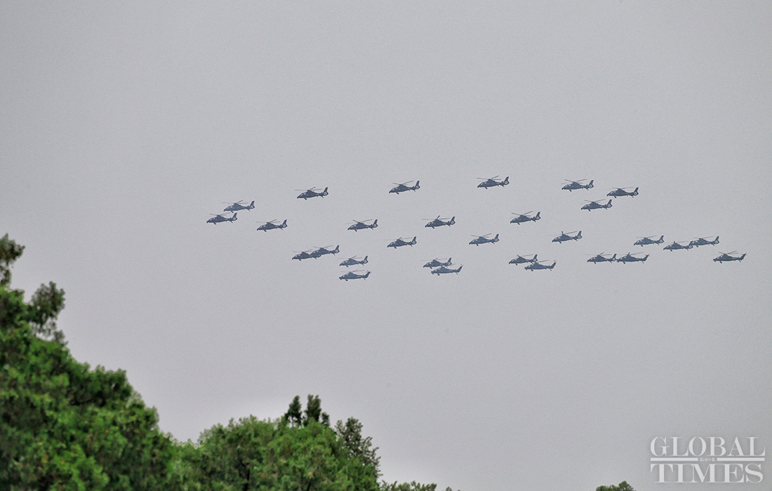 A total of 15 J-20 stealth fighter jets soared overhead through the Beijing skies in formation and the Z-8L, a new type of large military transport helicopter, made its debut by hanging a CPC flag and leading the aerial performance during the CPC centenary celebrations.