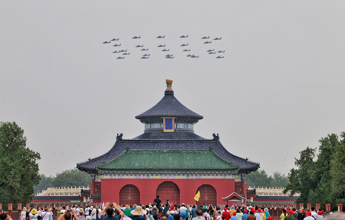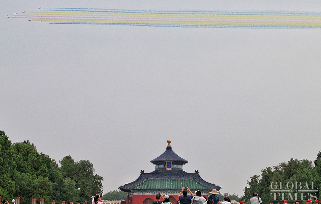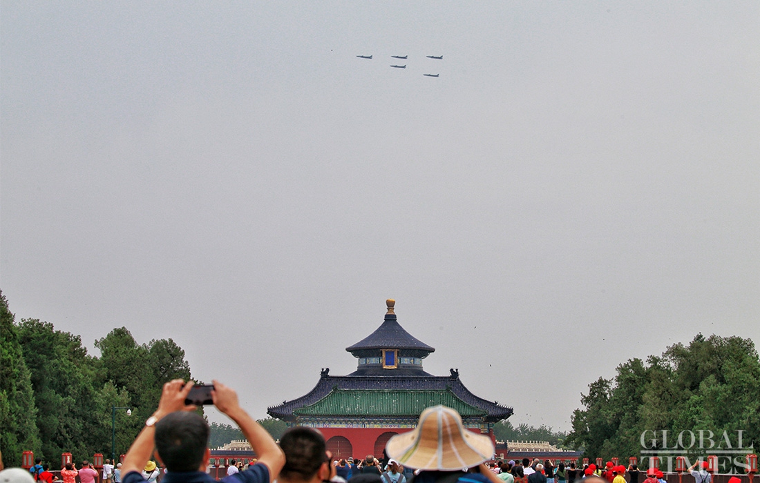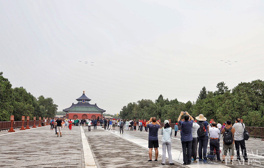 Members of the public watched and took pictures of the aerial formation over the ancient buildings of the Temple of Heaven Park.
