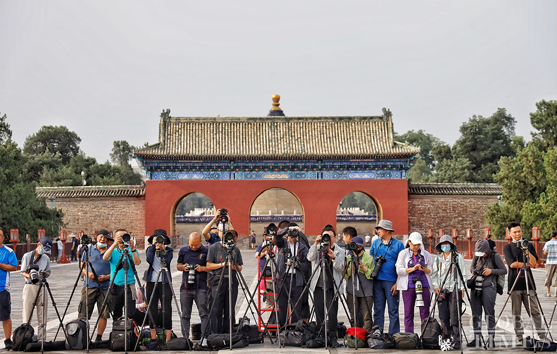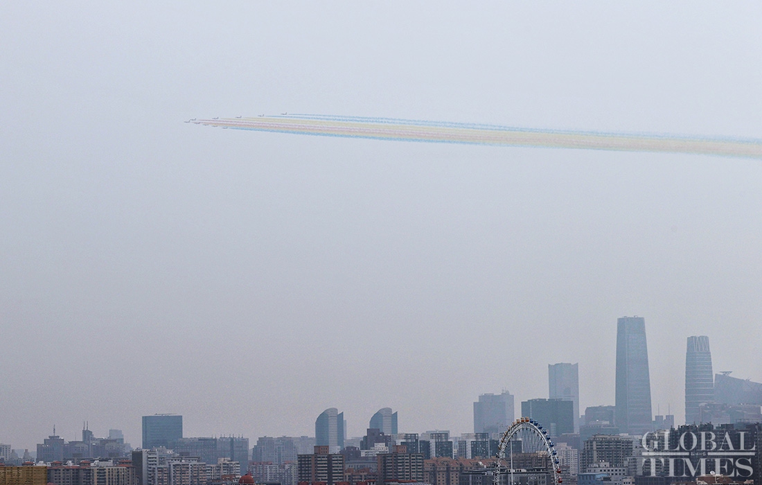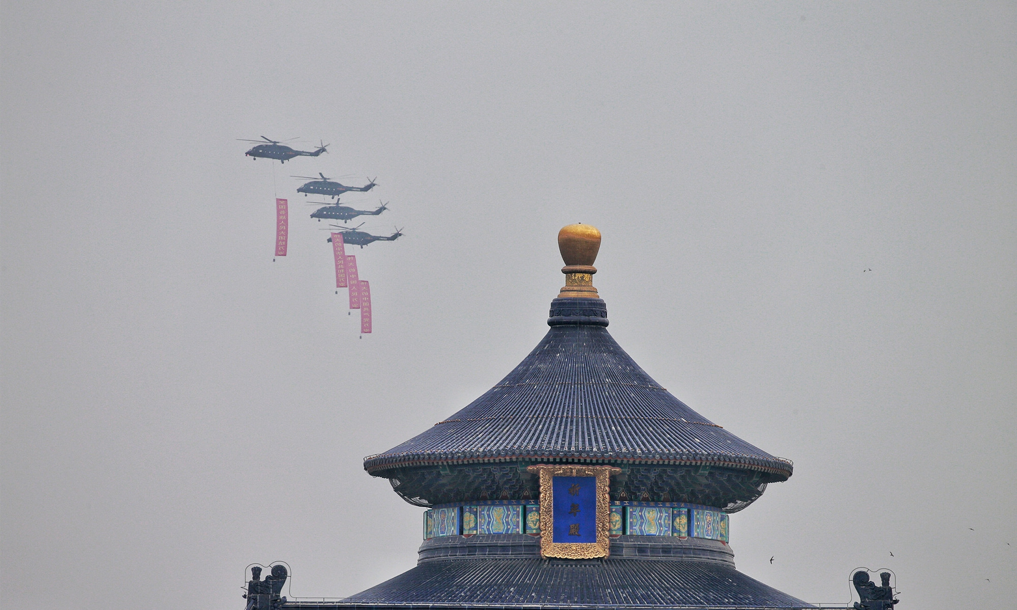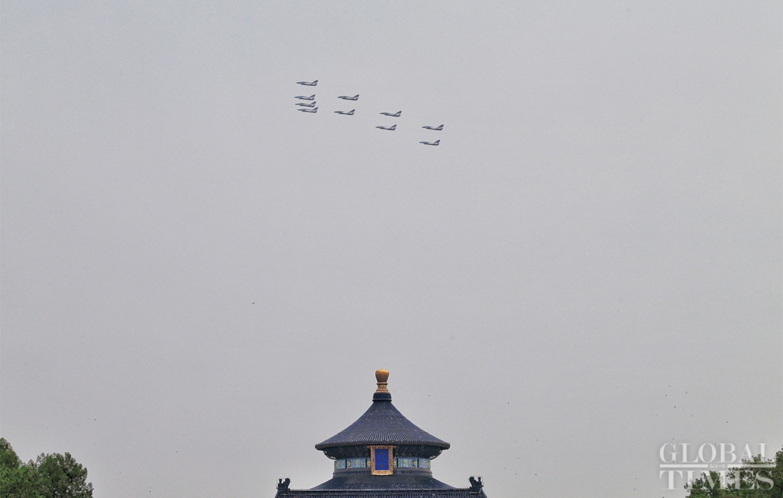 Members of the public watched and took pictures of the aerial formation over the ancient buildings of the Temple of Heaven Park.
