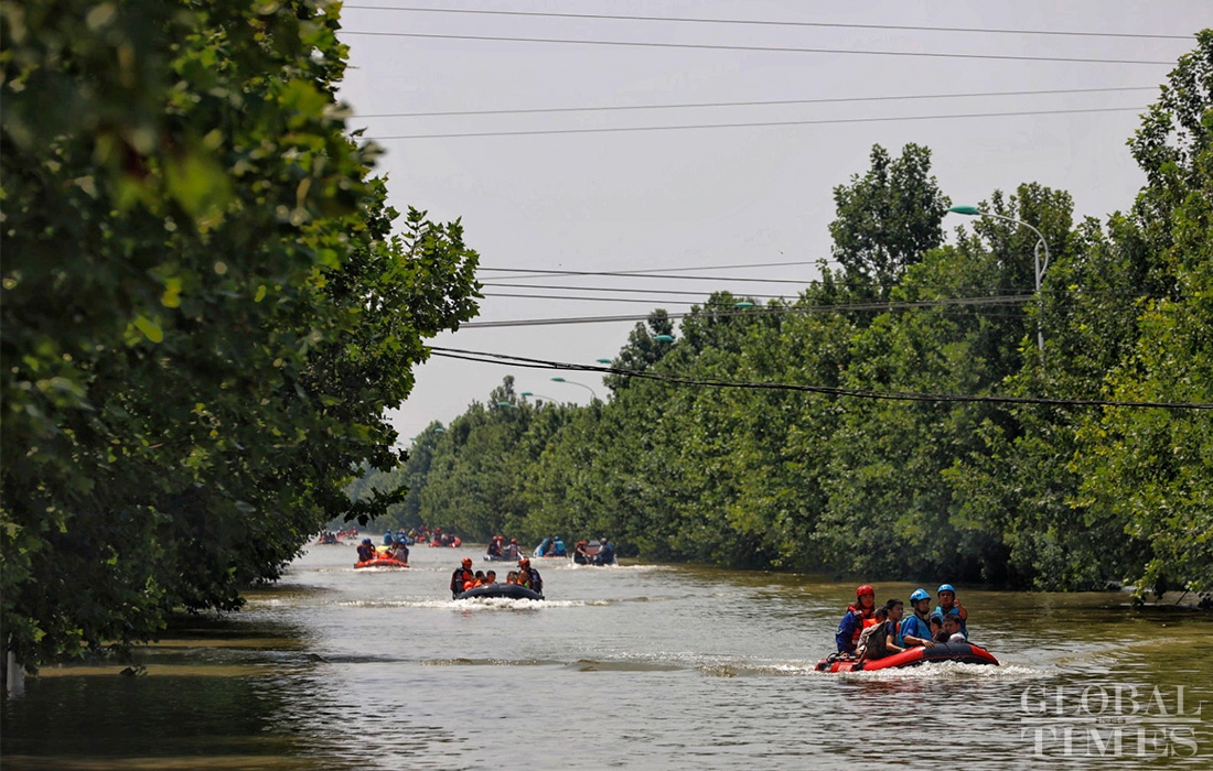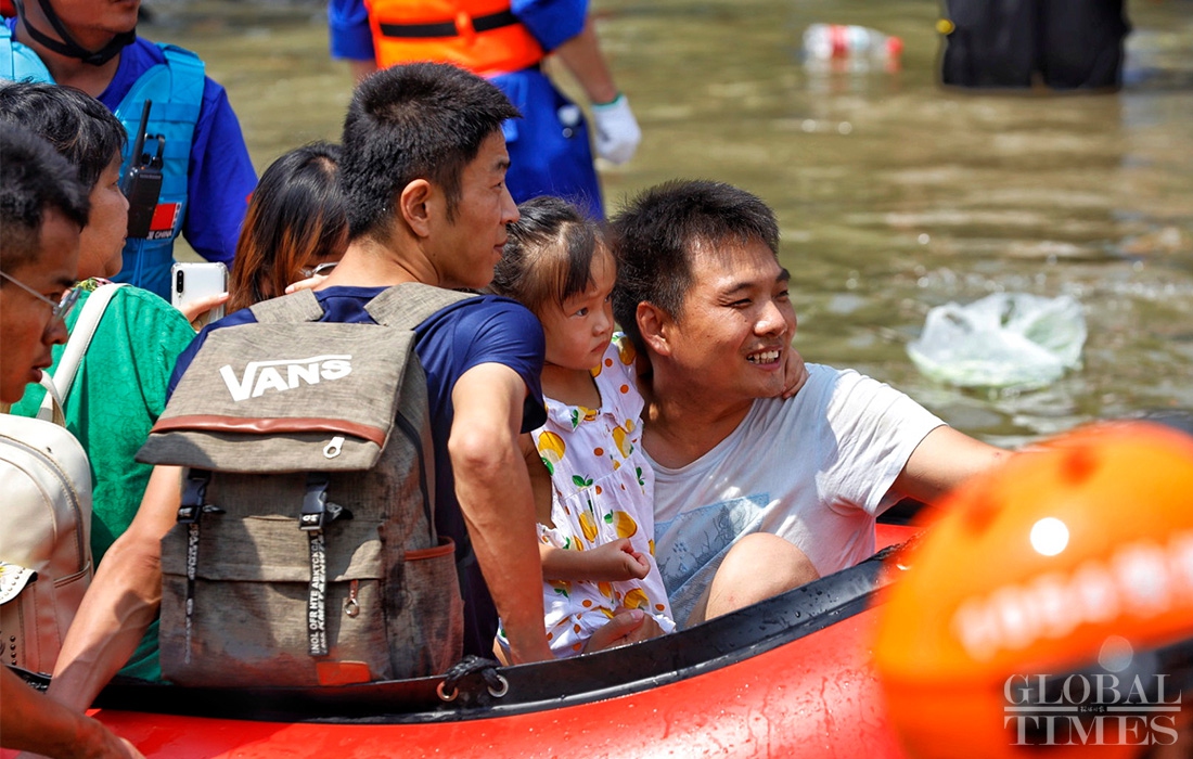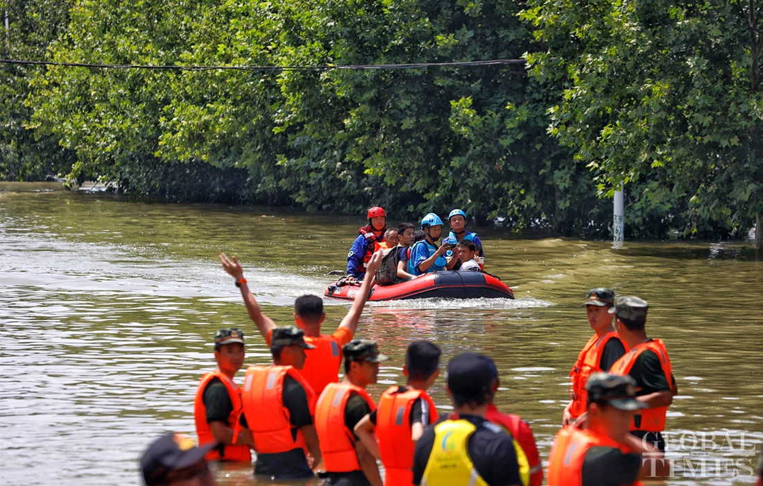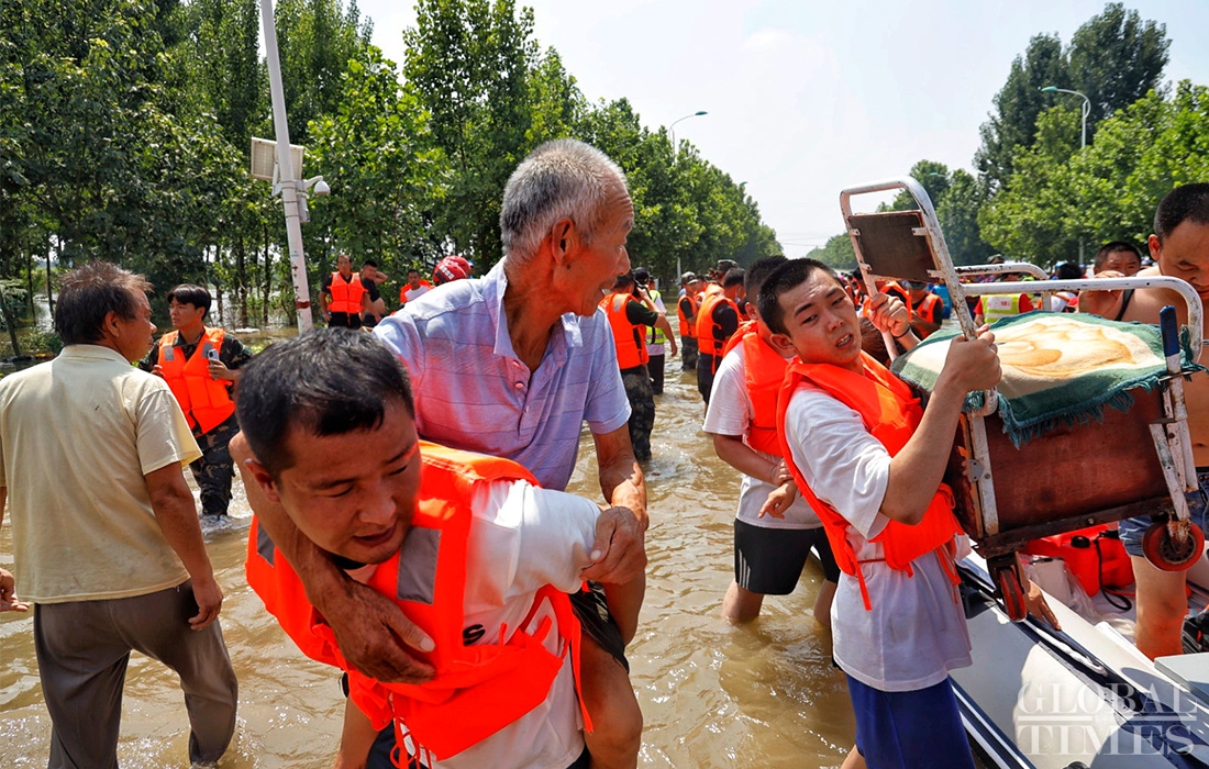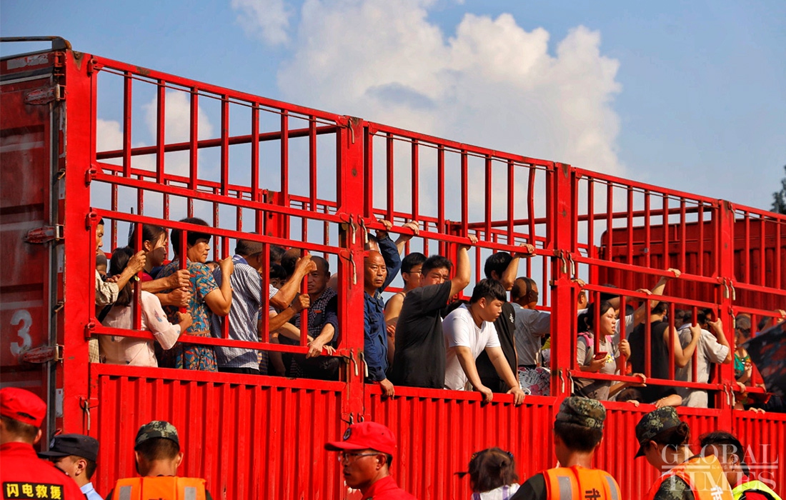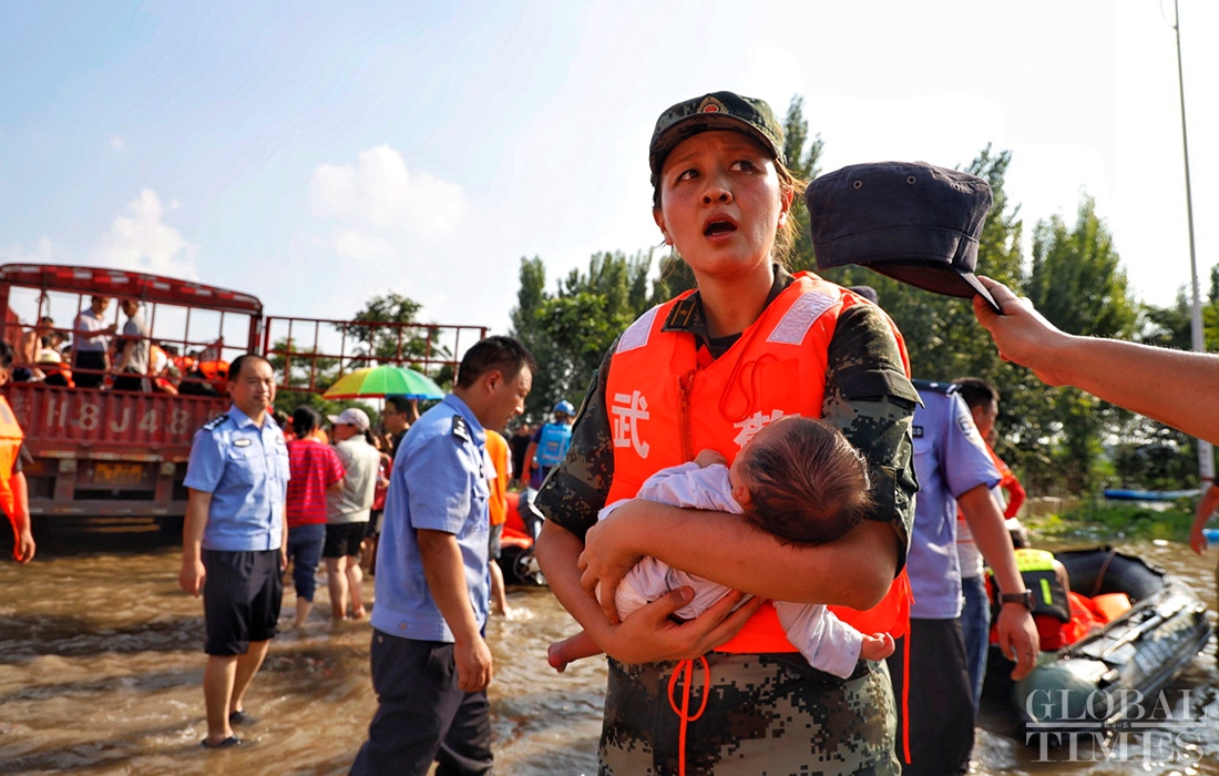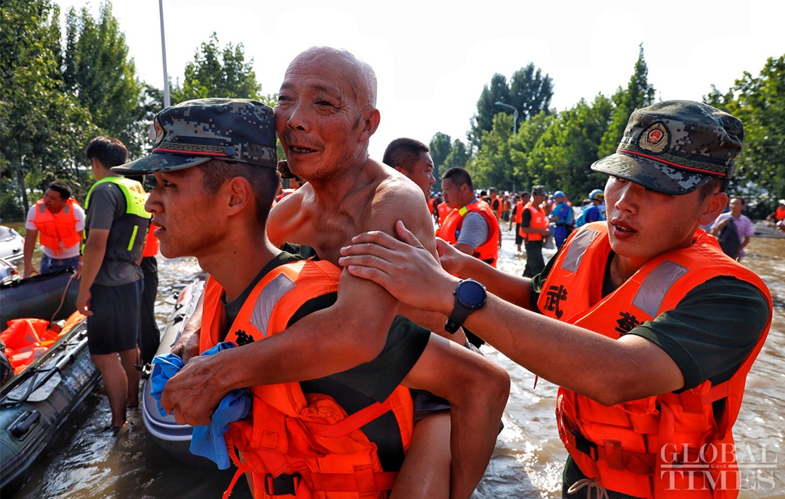 Armed police officers, soldiers and rescue teams evacuated people in Xinxiang, Henan Province, from early Saturday morning, after a canal breach flooded nearby villages. Nearly 1,000 people have joined in the rescue work. The villagers have been relocated to temporary shelters.