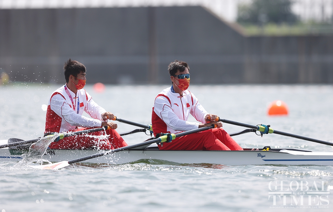 Chinese duo Zhang Liang and Liu Zhiyu claimed bronze in men’s double sculls Wednesday morning in Tokyo, the first Olympic medal in male scull for the Chinese national rowing team. Photos: Cui Meng/GT