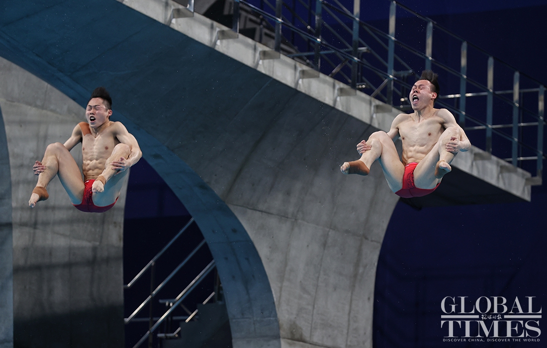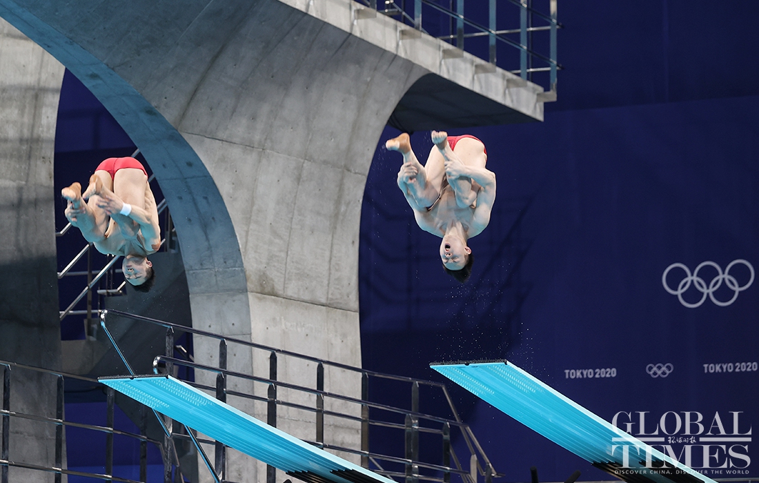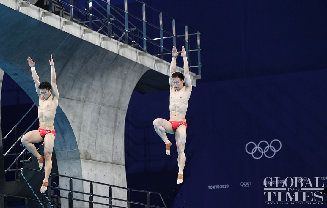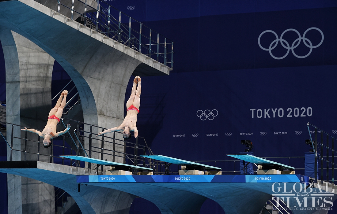 Diving pair Xie Siyi and Wang Zongyuan sealed China's 11th gold medal at Tokyo Olympics by winnning the 3m synchro springboard race.Photos: Cui Meng