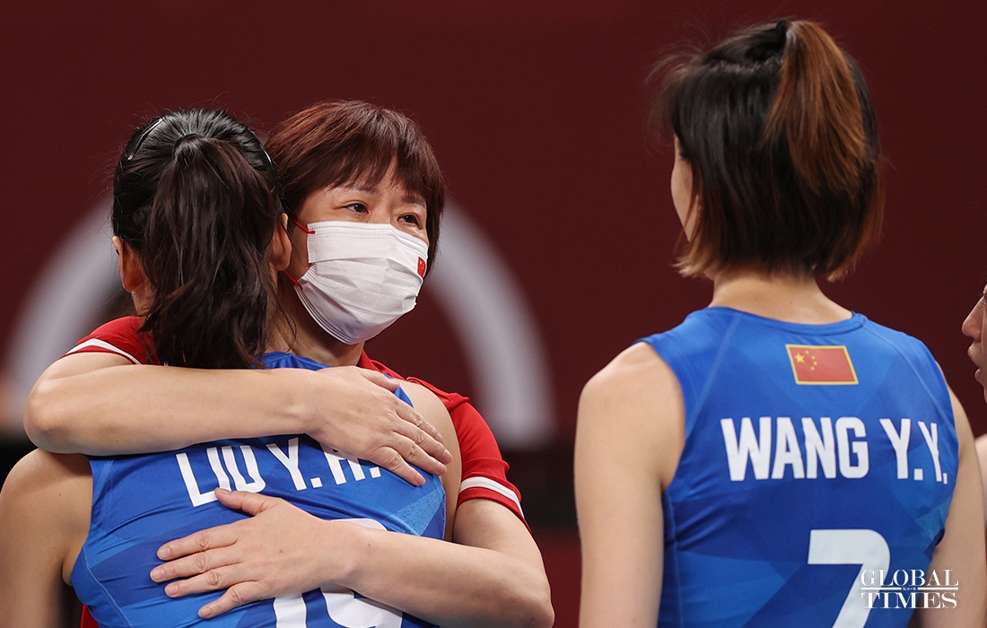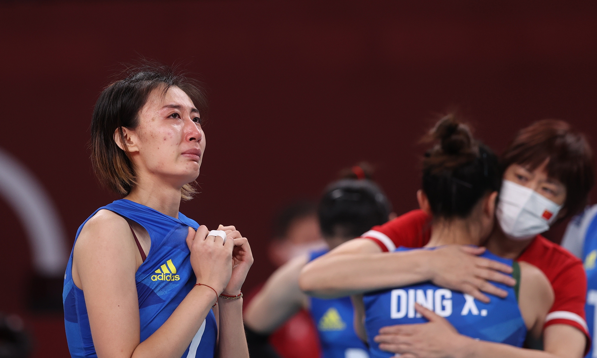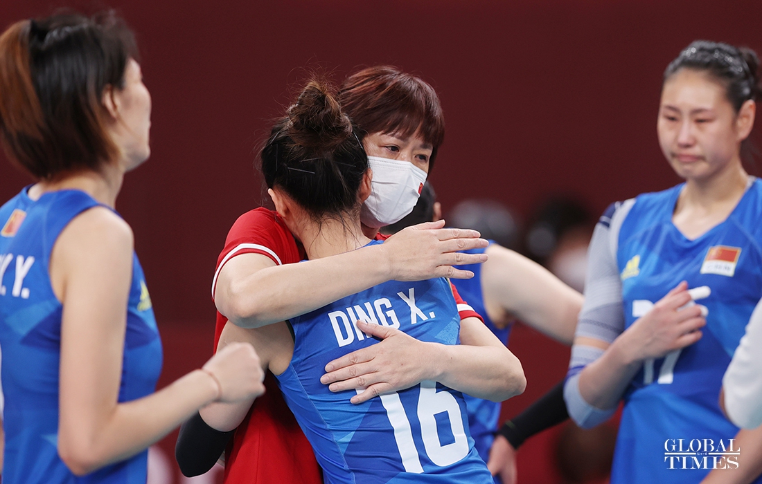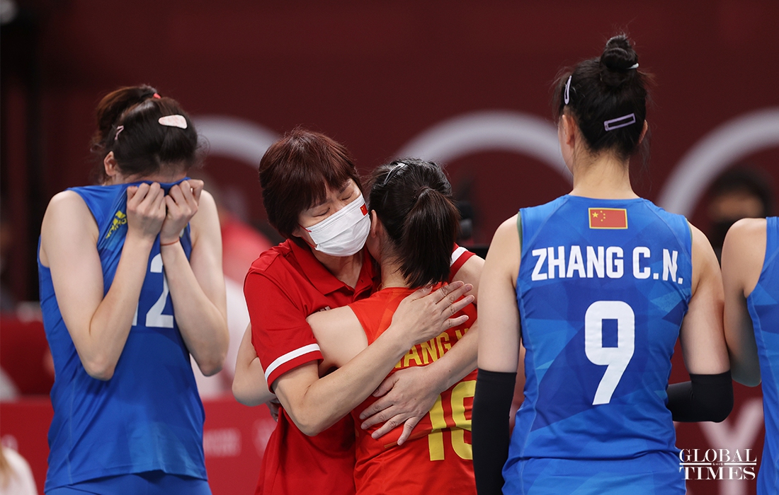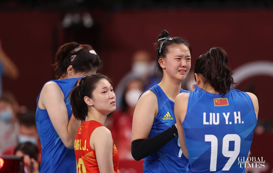 Chinese women’s volleyball team players and coaches burst into tears after ending their Olympics campaign with a 3-0 win over Argentina on Mon. Defending champions China only won 2 games in the 5 group stage matches.(Photos: Cui Meng/Global Times)