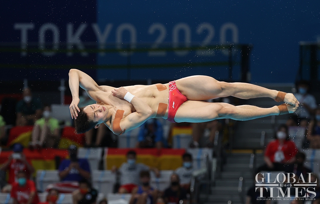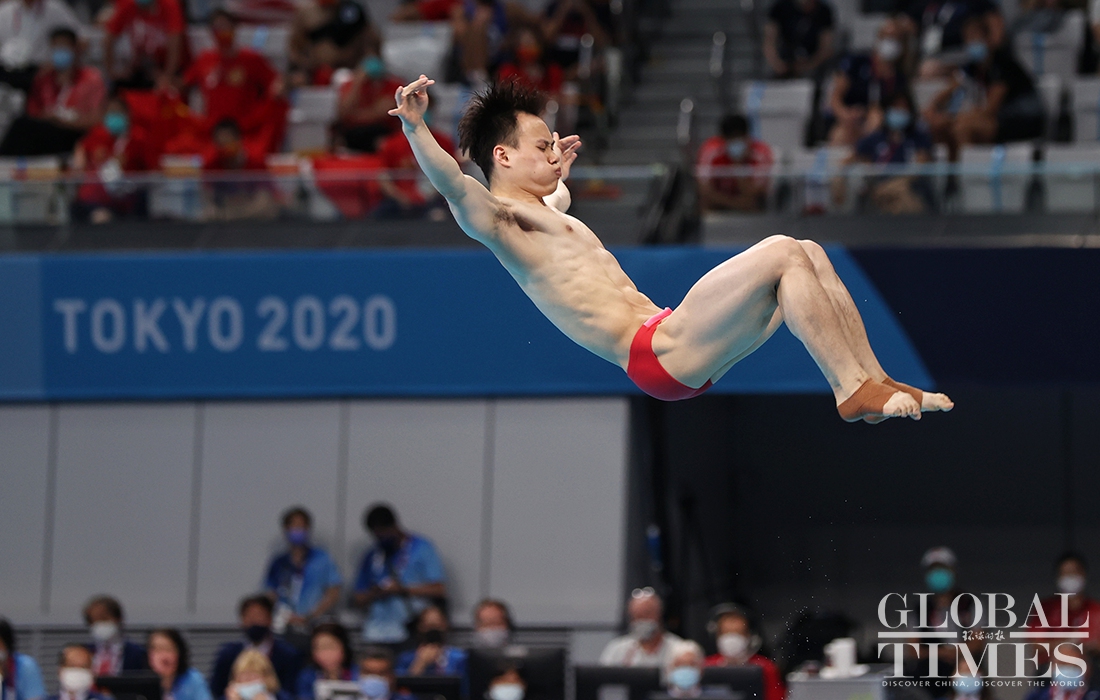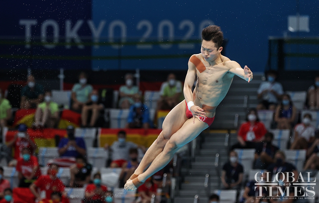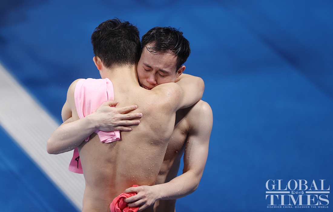 Now comes the 30th Olympic gold medal for China! Diver Xie Siyi claimed a gold medal in men’s 3-meter springboard final Tuesday afternoon. His teammate Wang Zongyuan took the silver. (Photos: Cui Meng/GT)