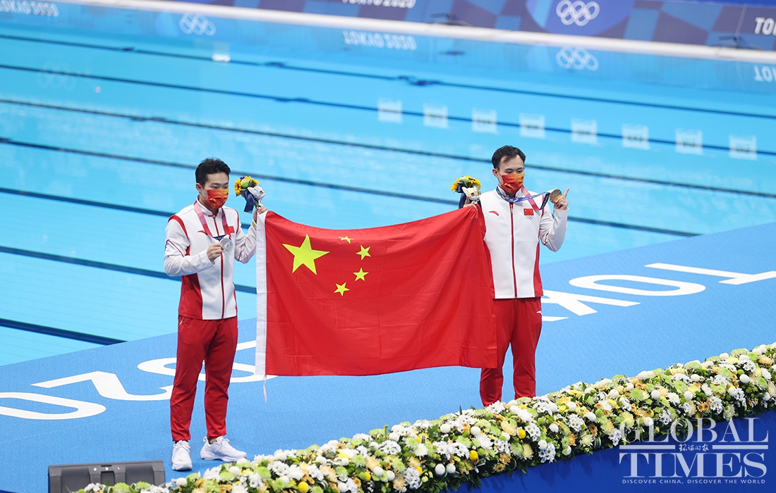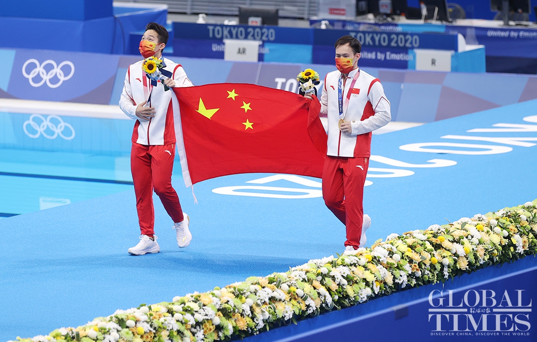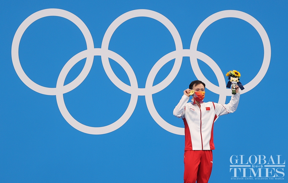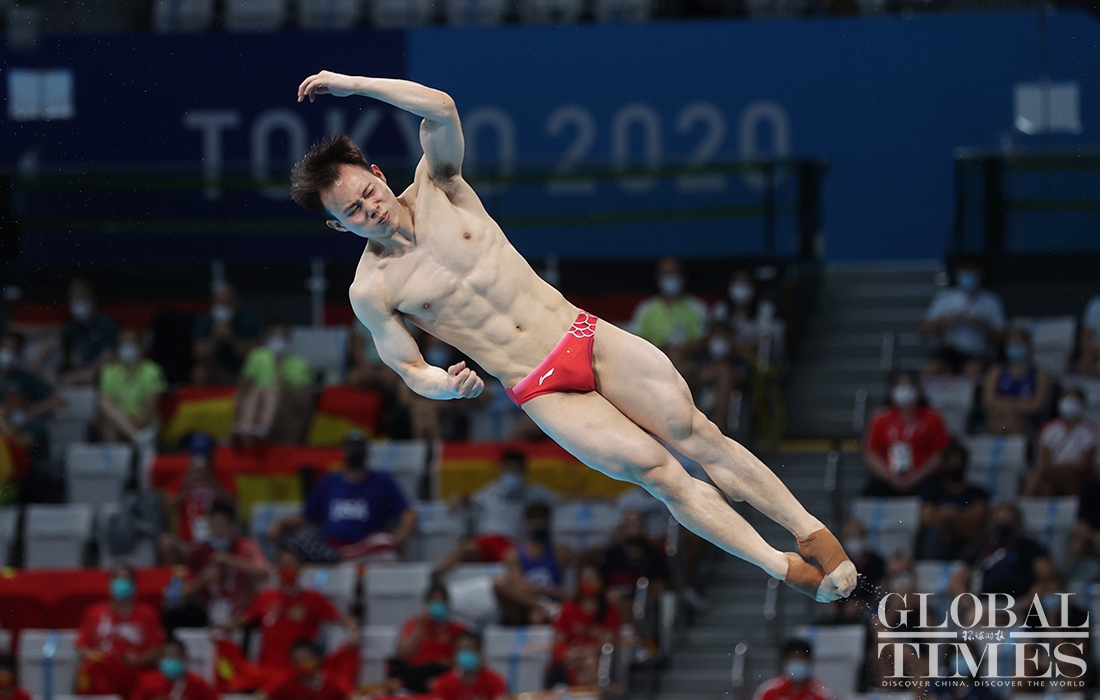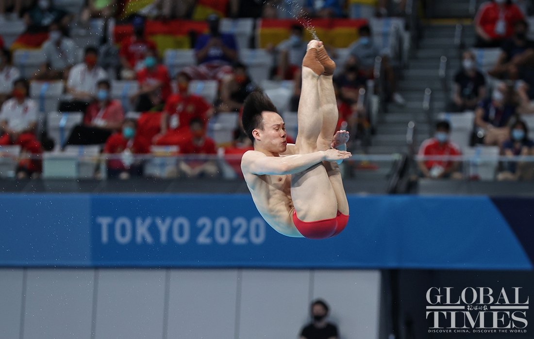 Now comes the 30th Olympic gold medal for China! Diver Xie Siyi claimed a gold medal in men’s 3-meter springboard final Tuesday afternoon. His teammate Wang Zongyuan took the silver. (Photos: Cui Meng/GT)