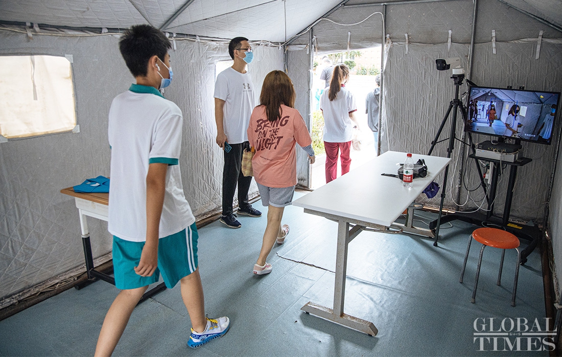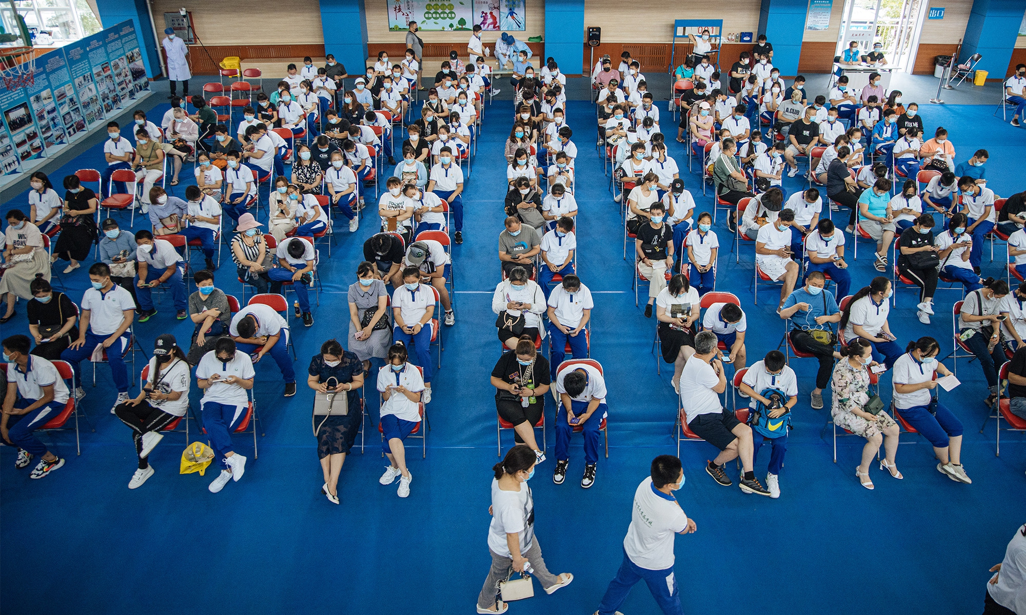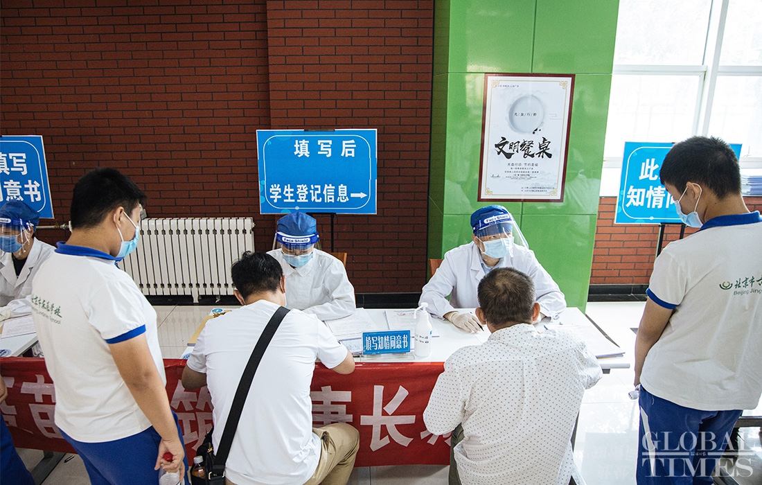 At the inoculation site of Pingguoyuan Middle School in Shijingshan District, Beijing, there is a consultation area, registration area, inoculation area, observation area and emergency treatment room. Unlike adult vaccinations, informed consent forms are filled out and signed by a minor's guardian.
