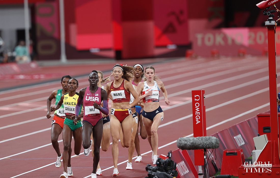China’s distance runner Wang Chunyu finished the women’s 800m final with a personal best 1:57:00, ranking 5th in the eight-woman race. Her appearance in the final is already a breakthrough for China. Photo: Cui Meng/Global Times figcaption >