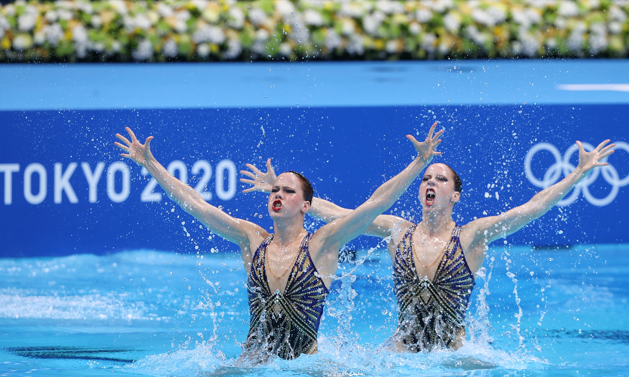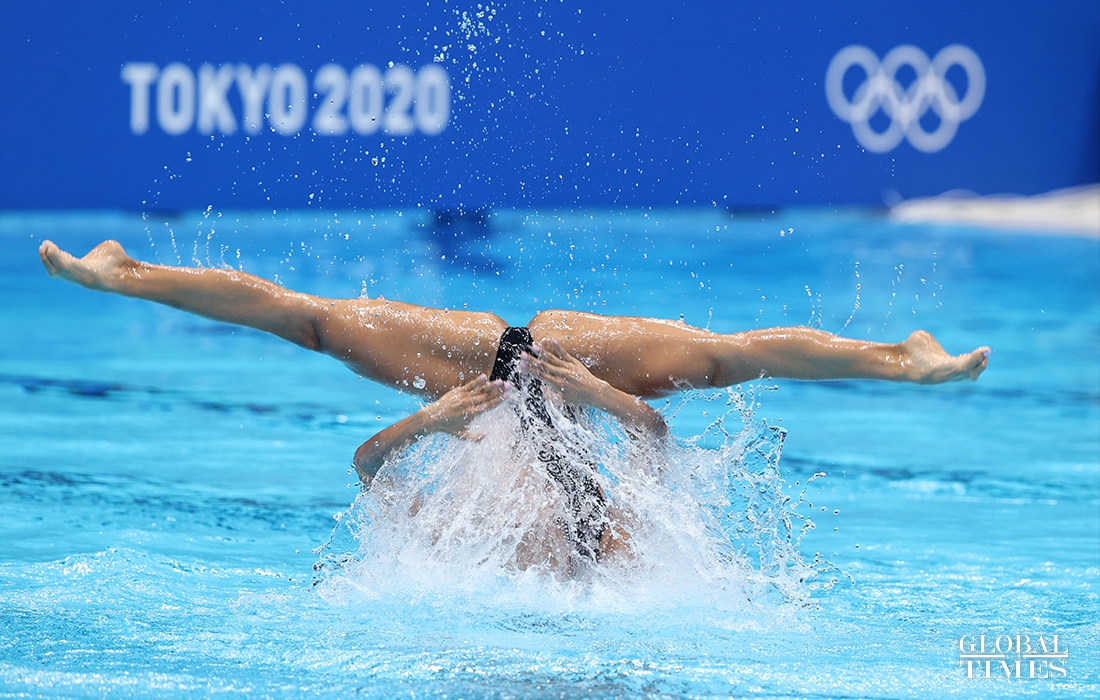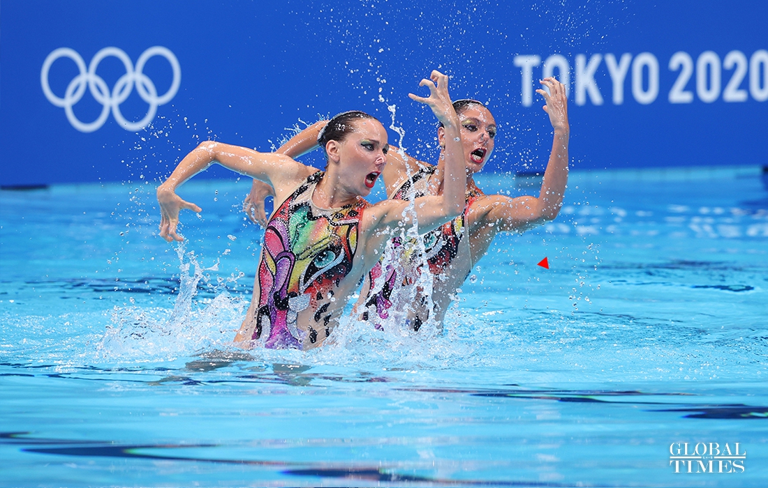 During the artistic swimming duets free routine final, athletes from 12 teams successfully finished their show. Russian Olympic Committee wins gold, China takes sliver and Ukraine bags the bronze. (Photos: Cui Meng/Global Times)