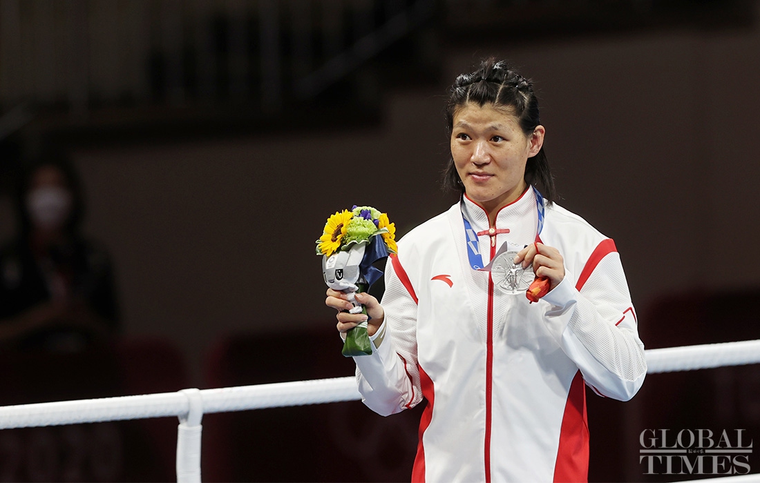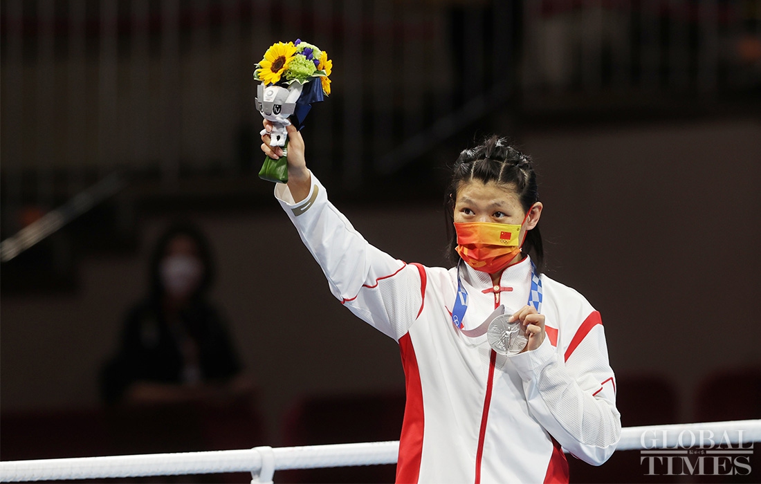 China's Gu Hong won a silver medal in women's welterweight final at Tokyo Olympic Games on August 7. Photos: Cui Meng/GT