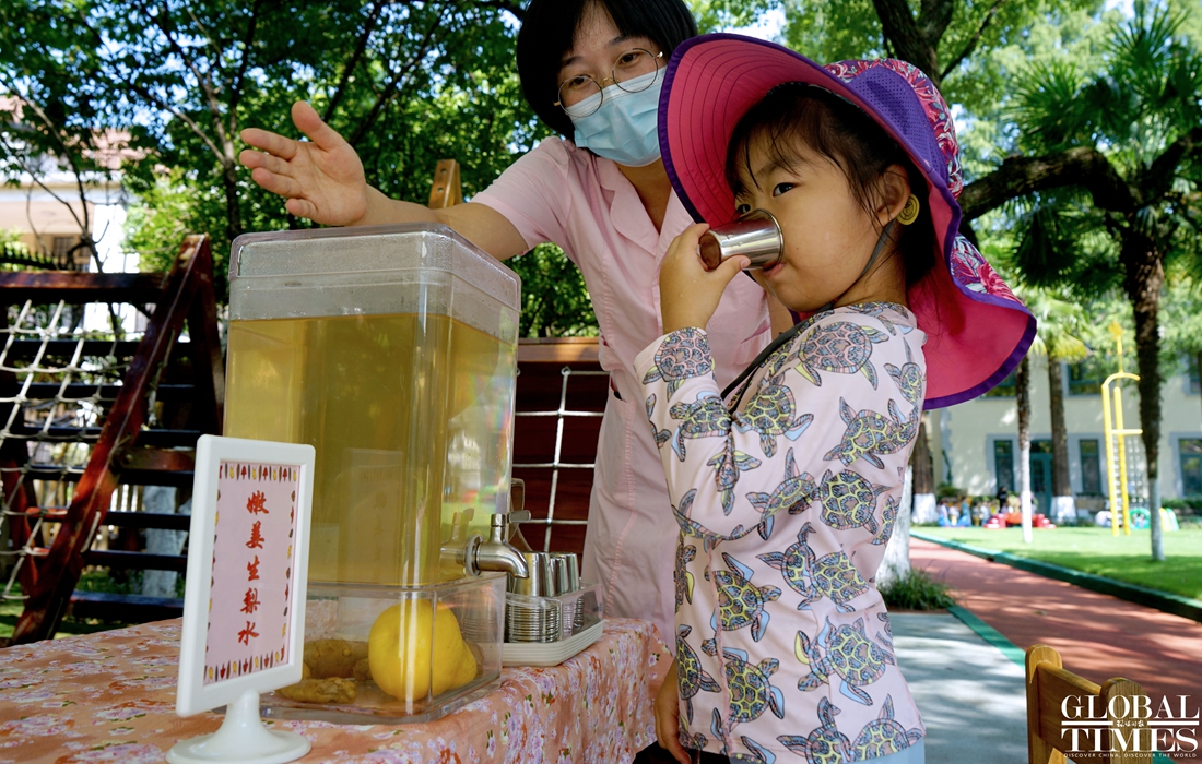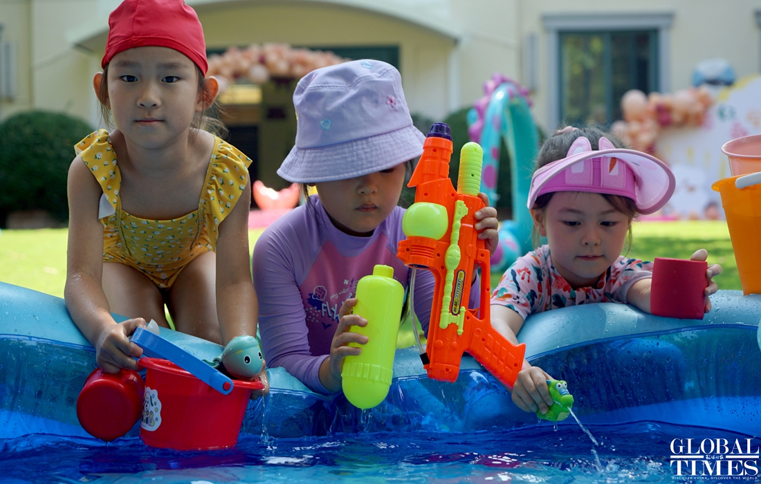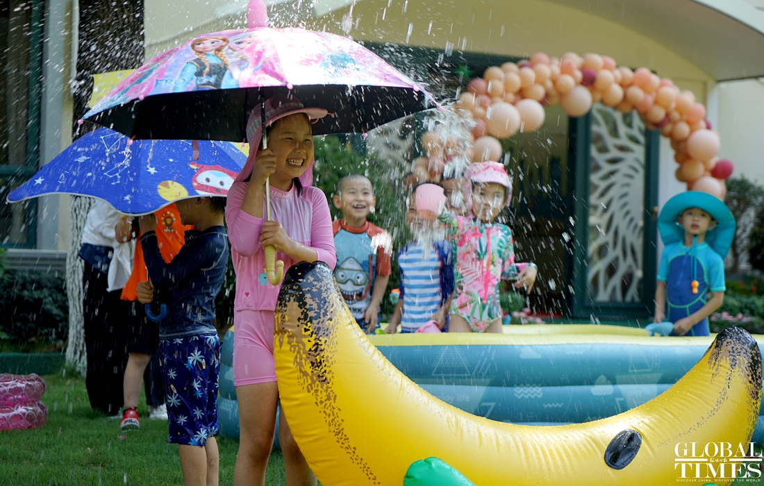 Teachers and kids played with water on the first school day as Shanghai still faces high temperatures.
