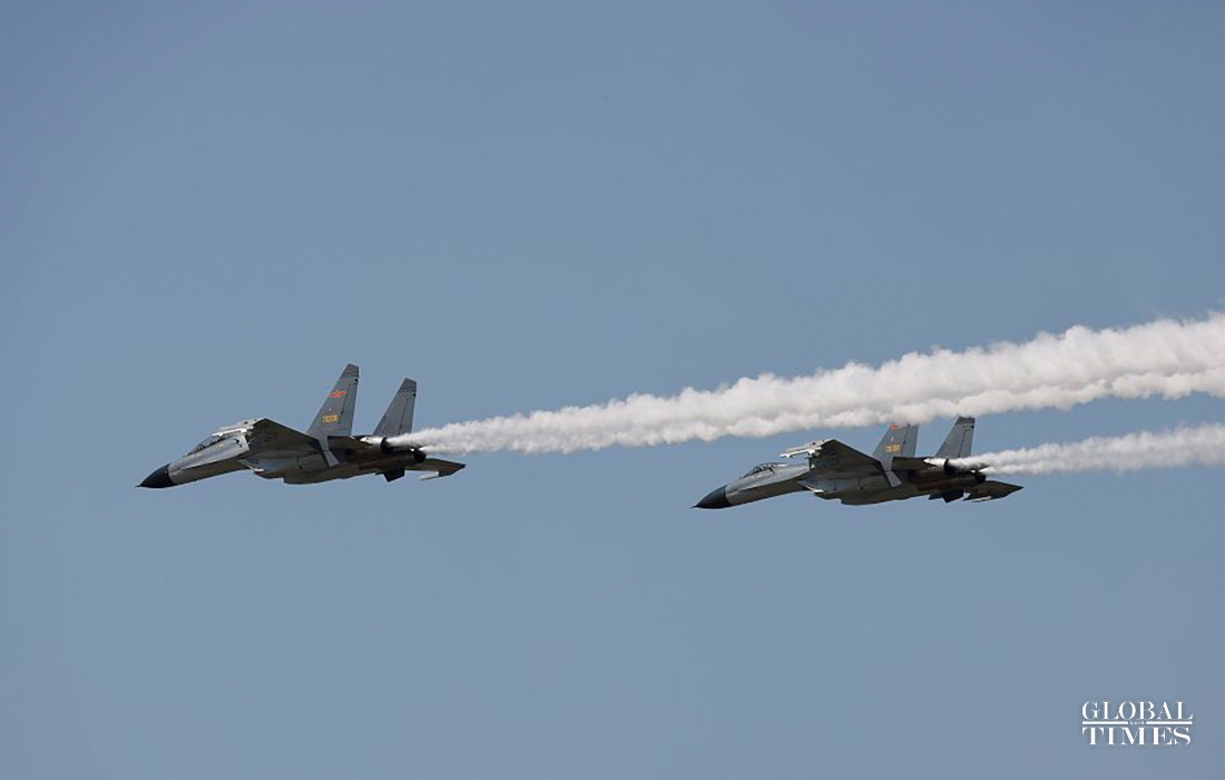 Two Chinese J-11B fighter jets escorted the #Y20 right after the large transport aircraft entered Chinese airspace. Photo: VCG figcaption >