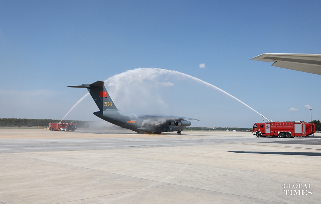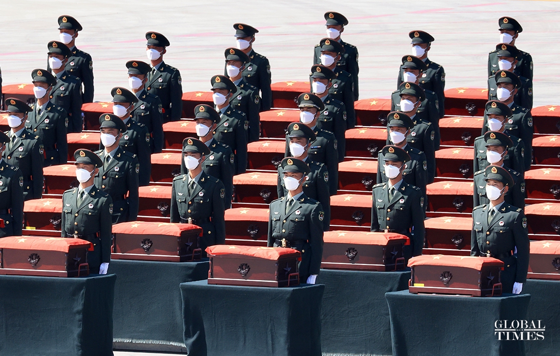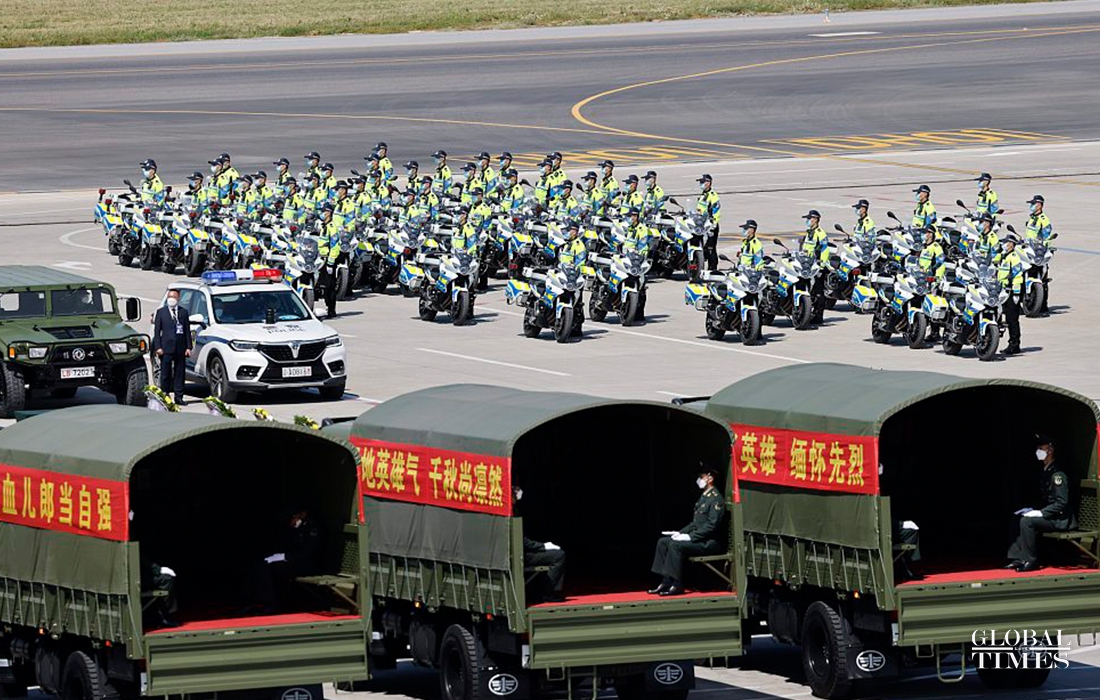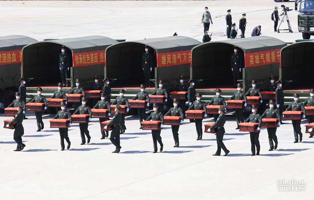 Some 7 decades since the War to Resist US Aggression and Aid Korea (1950-53), the eighth batch of 109 CPV martyrs returned from South Korea, arriving in Shenyang, NE China’s Liaoning Province. A PLA Air Force large transport aircraft Y-20 handed over the remains of the martyrs, the second mission following the first in 2020. Two fire-fighting trucks sprayed a "water gate" at Taoxian Intl Airport in Shenyang to show the highest respect for the returning heroes.