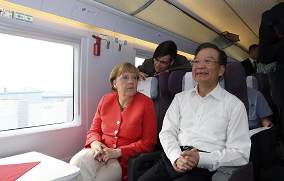 Former Chinese Premier Wen Jiabao accompanies German Chancellor Angela Merkel on the Beijing-Tianjin Intercity Express to North China's Tianjin on August 31, 2012. Photo: Xinhua figcaption >