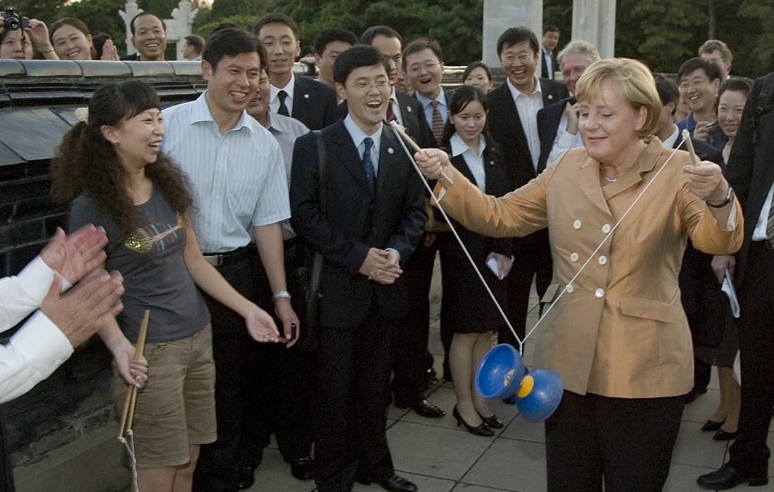 German Chancellor Angela Merkel plays a diabolo, or a Chinese yo-yo, in Beijing's Zhongshan Park, on August 27, 2007. Photo: CFP figcaption >