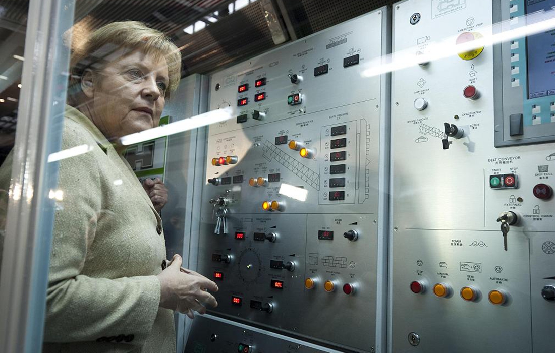 German Chancellor Angela Merkel stands in a control room during her visit to a plant of Herrenknecht Tunnelling Equipment Co Ltd in Guangzhou, South China’s Guangdong Province on February 3, 2012. Photo: CFP figcaption >