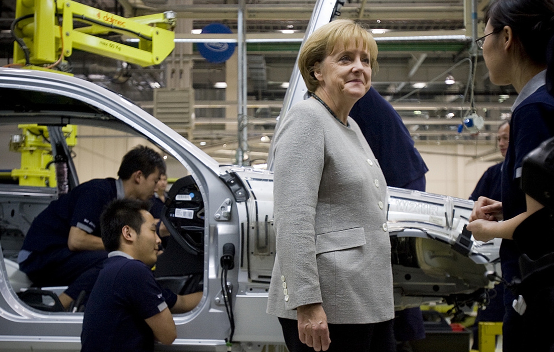 German Chancellor Angela Merkel takes a tour of the Beijing Benz-Daimler Chrysler plant on October 23, 2008. Photo: CFP figcaption >