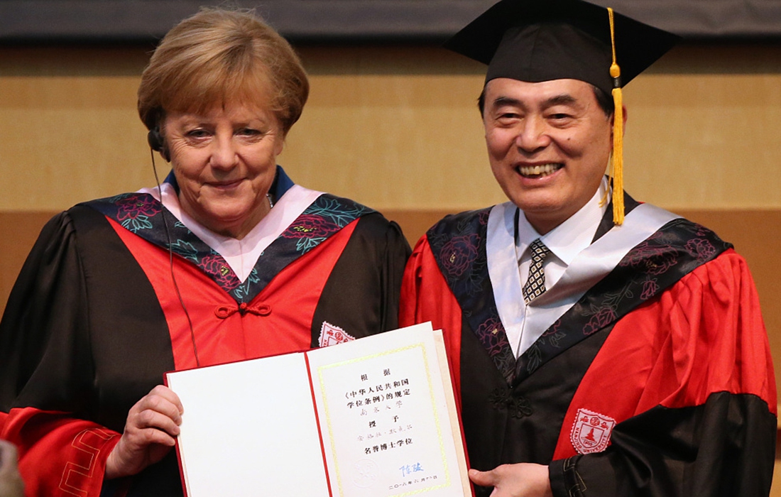 German Chancellor Angela Merkel receives an honorary doctorate from Nanjing University president Chen Jun in Beijing on June 12, 2016. Photo: CFP figcaption >