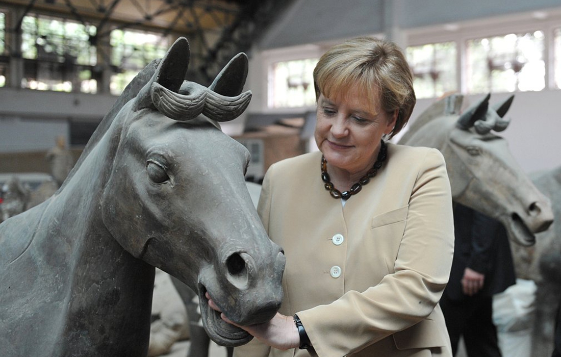 German Chancellor Angela Merkel stands between two horses of the Terracotta Army in Xi'an, Northwest China’s Shaanxi Province on July 17, 2010. Photo: CFP figcaption >