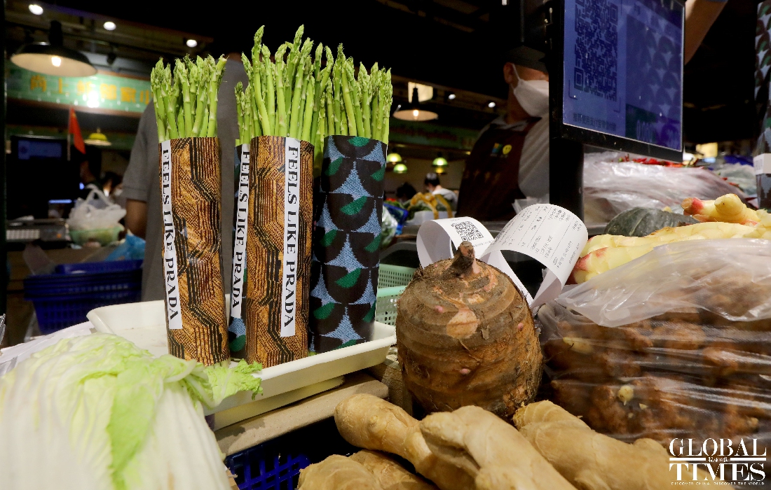 A wet market decorated with Prada branding in Shanghai has gone viral online. Everything in the store is wrapped with Prada packaging and paper hand bags, making it the most affordable items offered by the luxurious brand. The vegetable market covers an area of 2,000 square meters, with a total of 50 stalls selling vegetables, fruits, seafood, flowers and meat. The exterior wall of the building and the vegetable market stalls are decorated with Prada's geometric patterns for autumn and winter this year.