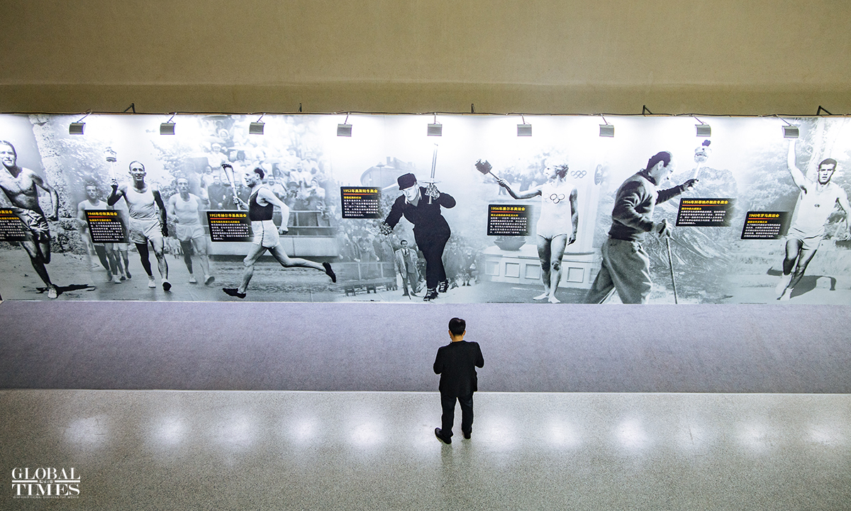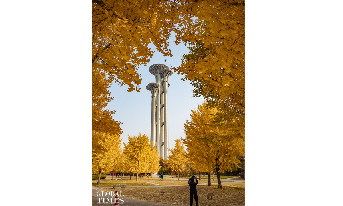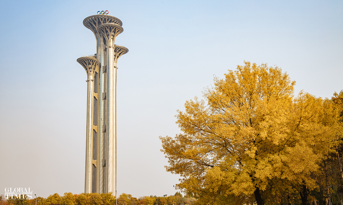 As Beijing's scenery turns autumn, golden ginkgo dotted with the Beijing Olympic Tower in the Beijing Olympic Forest Park, it signals next year's Olympics is approaching. An exhibition based on the theme of the Olympic Torch Relay kicked off and the flame for the Beijing 2022 Winter Olympics also will be displayed to the public at the Beijing Olympic Tower. Photos: Li Hao/GT