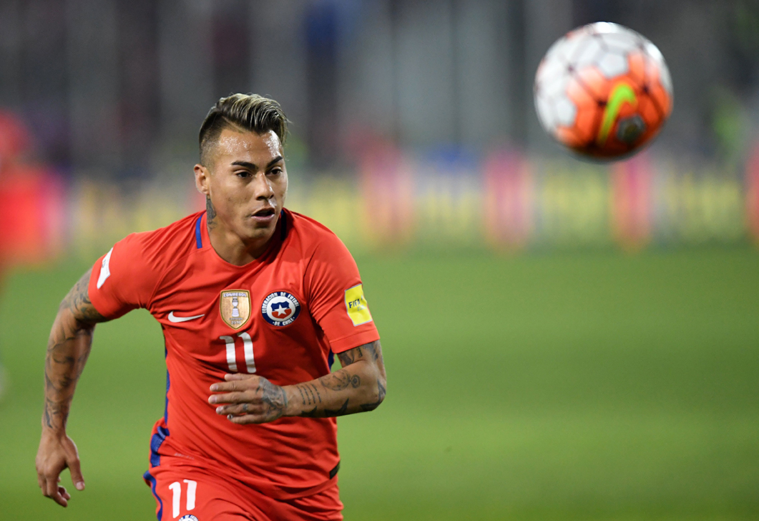 Chile's Eduardo Vargas chases the ball during his Russia 2018 World Cup qualifier against Bolivia in Santiago on September 6, 2016. Having played in La Liga and the Premier League, Eduardo Vargas now plays for Bundesliga’s TSG 1899 Hoffenheim. The 26-year-old has earned 60 caps for Chile, scoring 31 goals. He was Chile’s top scorer in Chile’s victories at the 2015 Copa America and Copa America Centenario in 2016. Photo: CFP figcaption >