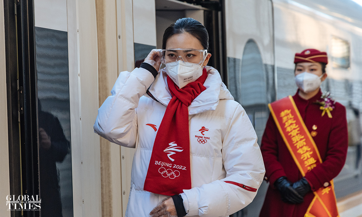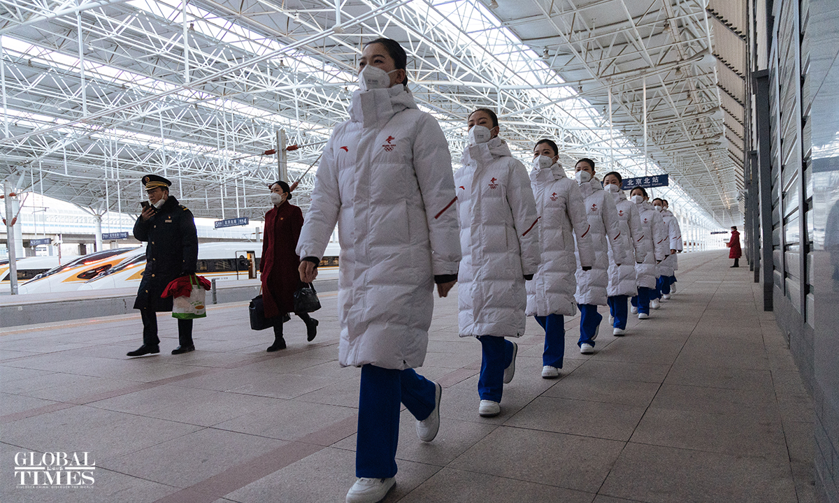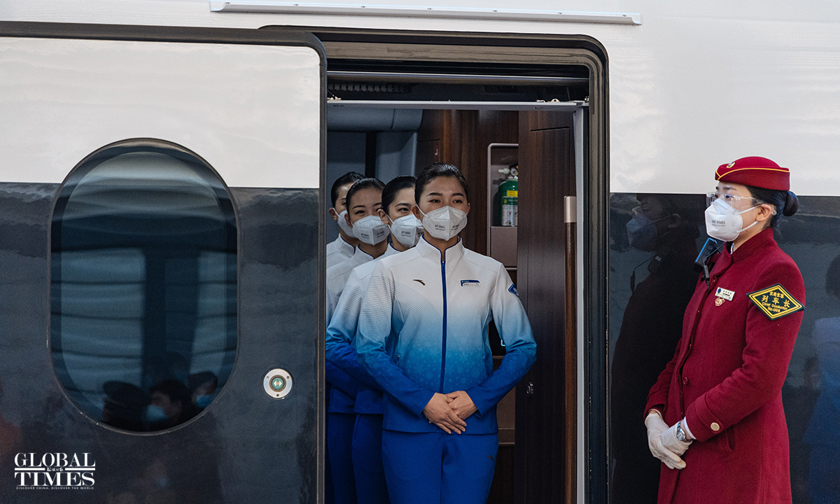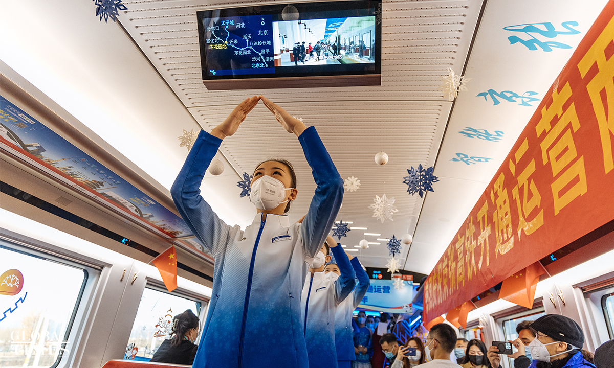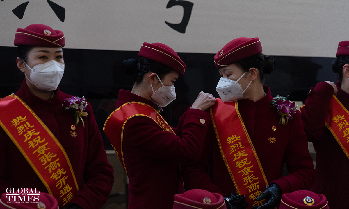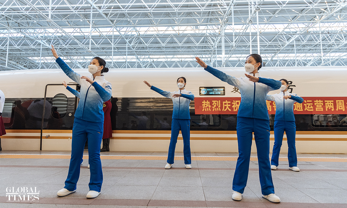 An event to celebrate the second anniversary of the opening of the Beijing-Zhangjiakou high-speed railway was hold at the Beijing North Railway Station on December 30, 2021. Crew members offered a performance and showed service etiquette to passengers.
