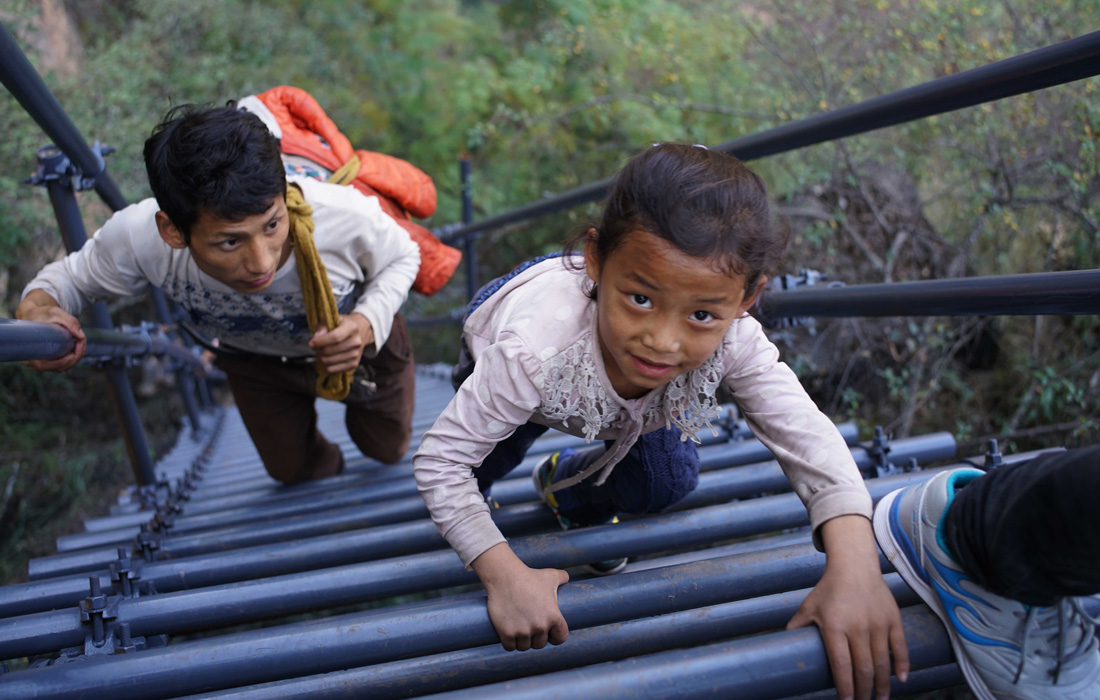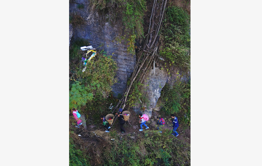 The children approach the final cliff on the journey home. With the steel staircase in place, the rattan ladders that hang vertically down the face of the mountain lie untouched. Photo: CFP figcaption >