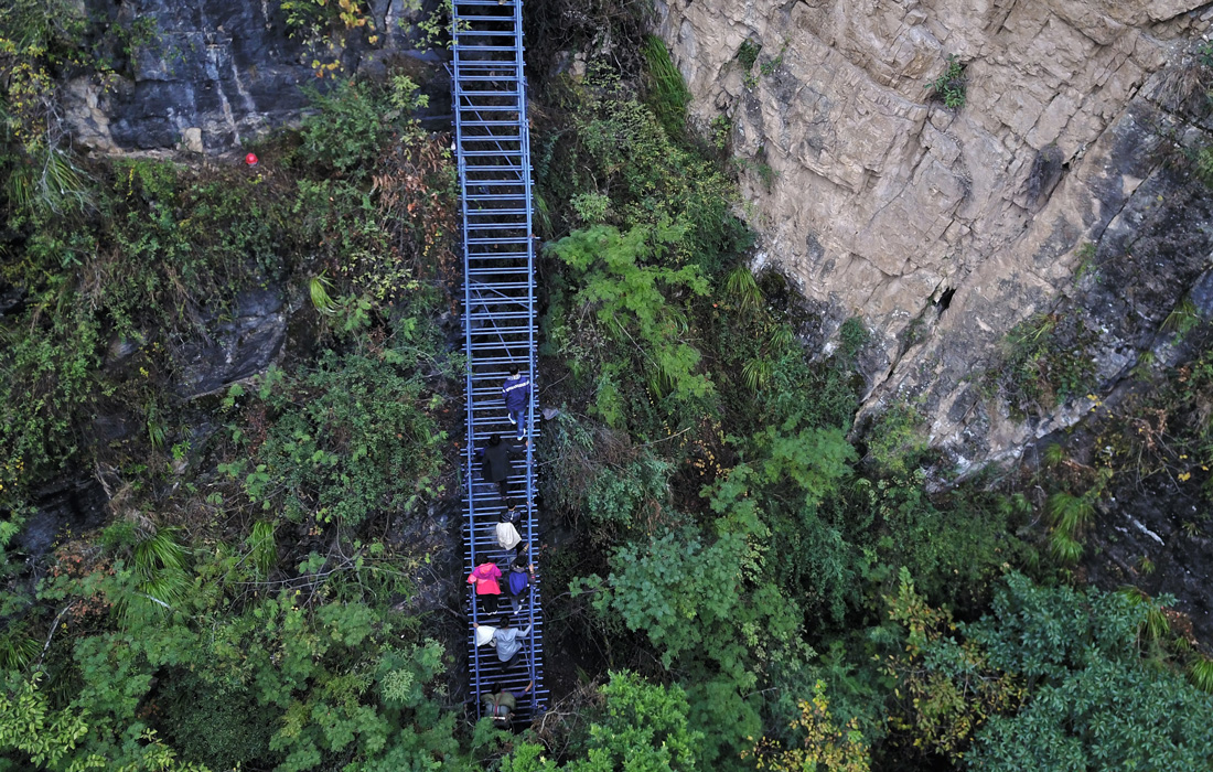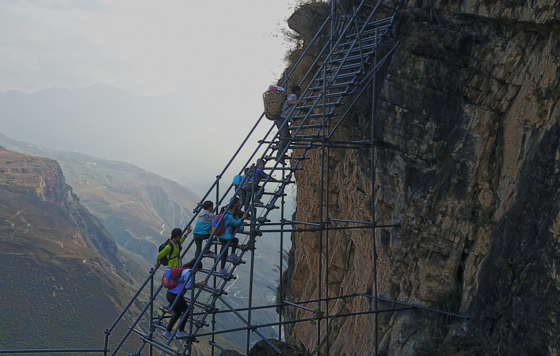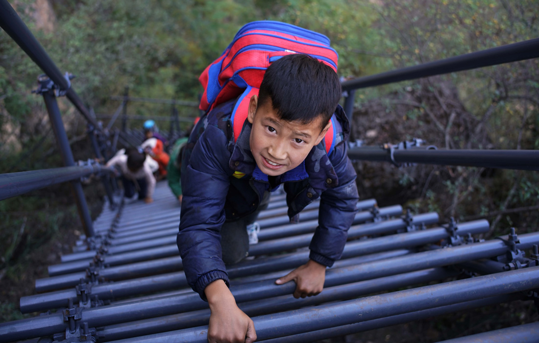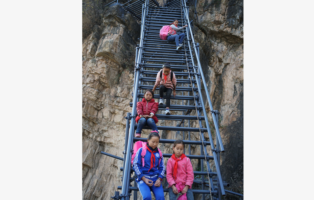 Children living in a cliff-top mountain village in southwestern China can now climb a secure steel stairway to and from school, having been installed in early November, the Beijing News reported.