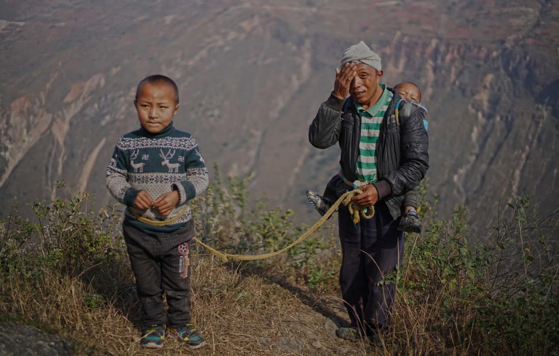A villager named Shi Ga uses a rope to tie himself to his 7-year-old son the first time they climb the steel staircase. “It’s easier to climb up now,” said Shi, carrying his 4-year-old son on his back. Even though the new path is in place, he still uses the rope in case his son has trouble adapting to the staircase. Photo: CFP figcaption >