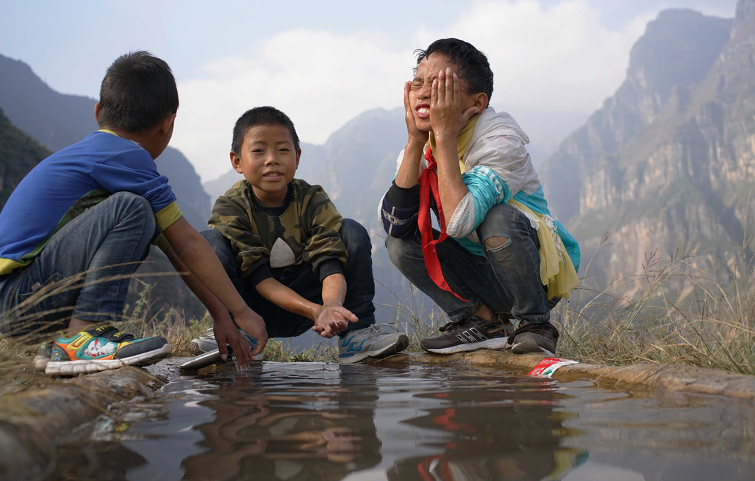 Children wash their faces with puddle water after arriving at the final rest stop on the climb home. The local county is planning to build a new, safer road leading to the cliff-top village, requiring a total investment of 35.1 million yuan ($5.09 million), the report said. Photo: CFP figcaption >