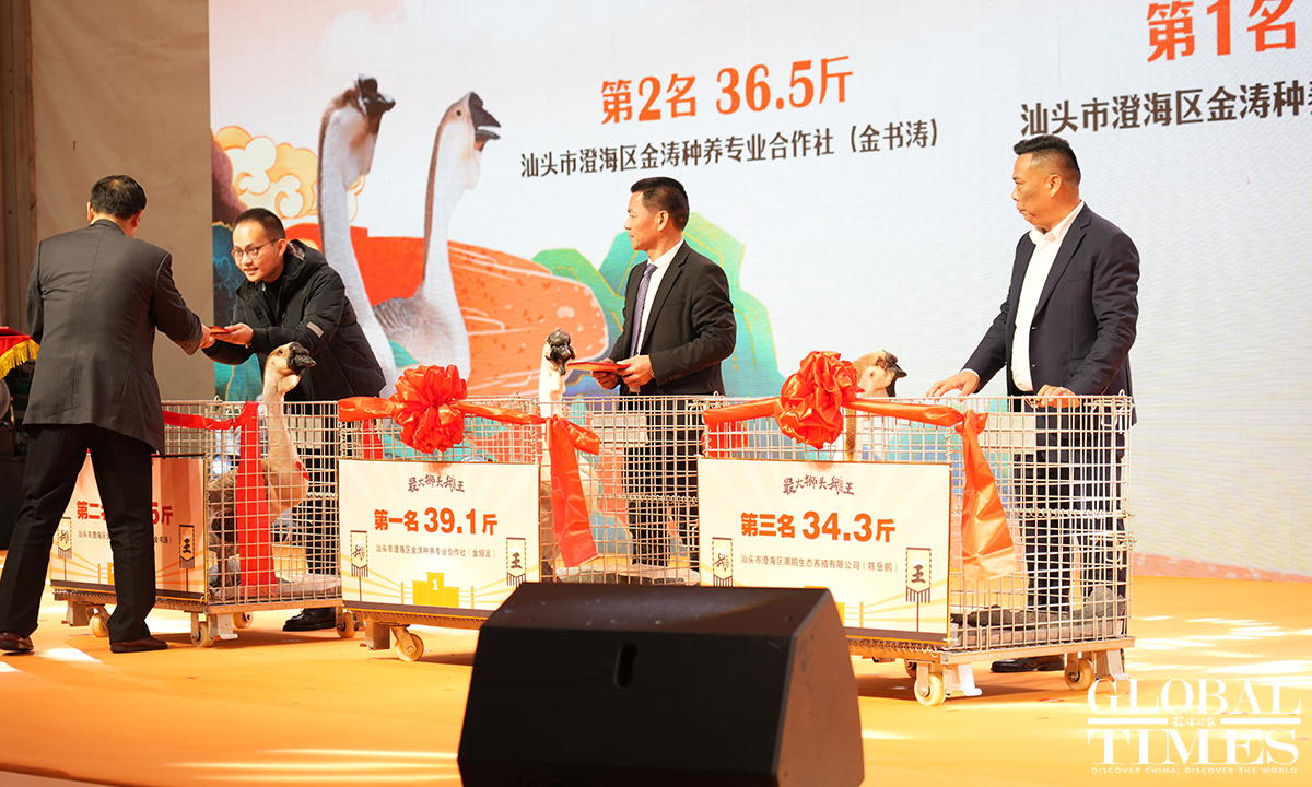The opening ceremony of the 2022 Lion-head Goose Cultural Festival was held in Chenghai District of Shantou, South China’s Guangdong Province, on Tuesday afternoon. Kicking off with a drum beating and Two Fighting Geese performances, the ceremony rewarded masters of goose delicacies, breeders of the top 3 biggest lion-head geese in 2021 and local enterprises that made great contributions to the export of goose products. Participants also got the chance to taste various dishes made of goose.