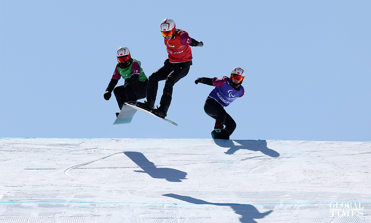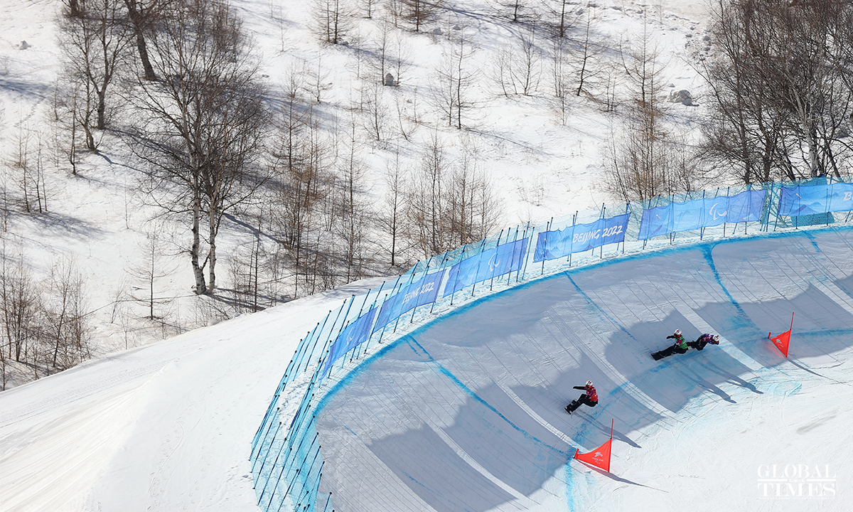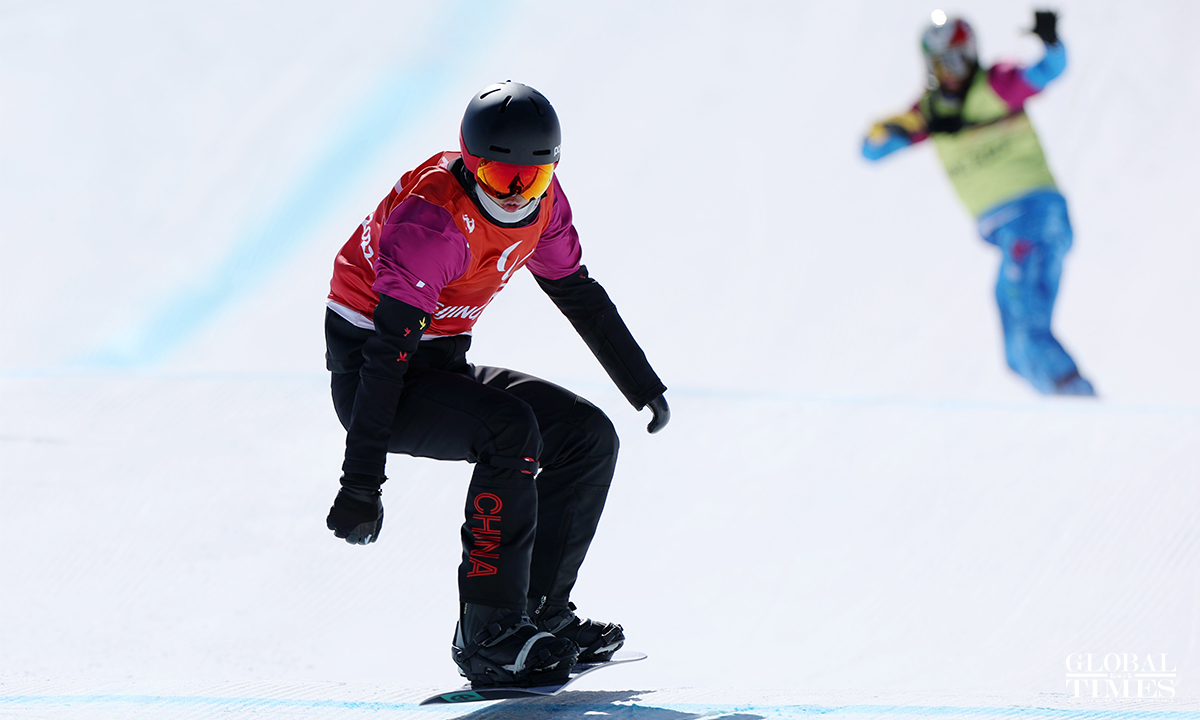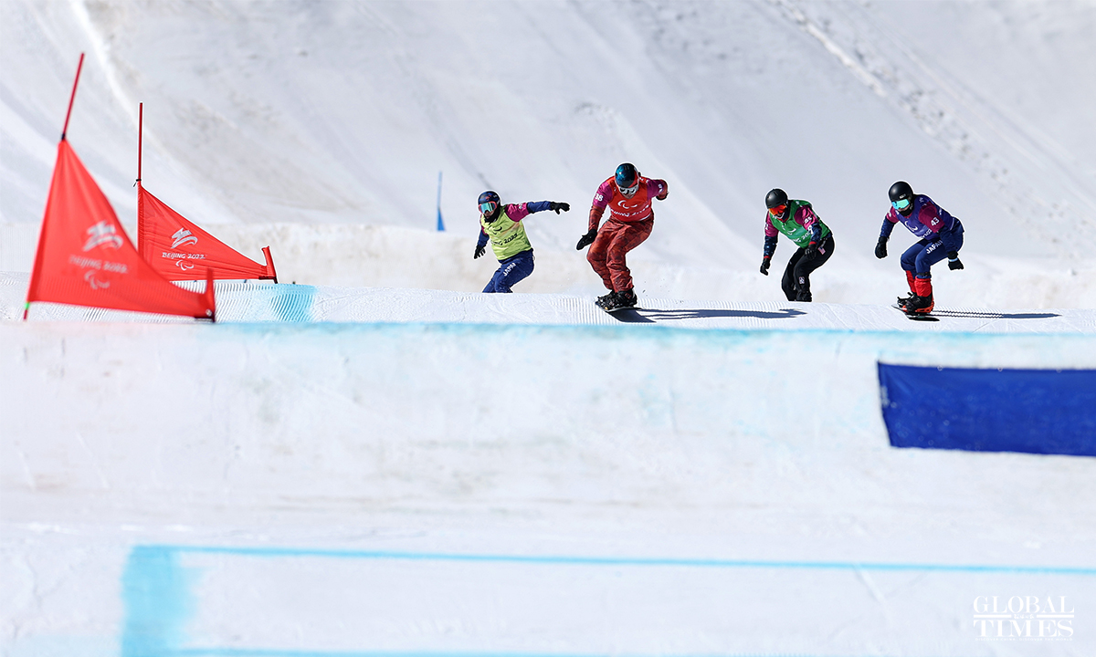 The Para Snowboard competition was held at Genting Snow Park in Zhangjiakou, China’s Hebei Province on Monday during the Beijing 2022 Winter Paralympics. Including two events of banked slalom and obstacle chase, athletes are divided into one level of upper limb disability and two levels of lower limb disability according to the degree of disability, and a total of 8 gold medals are available. Photos: Cui Meng/GT