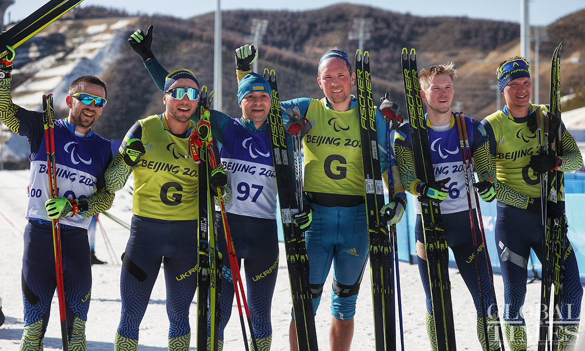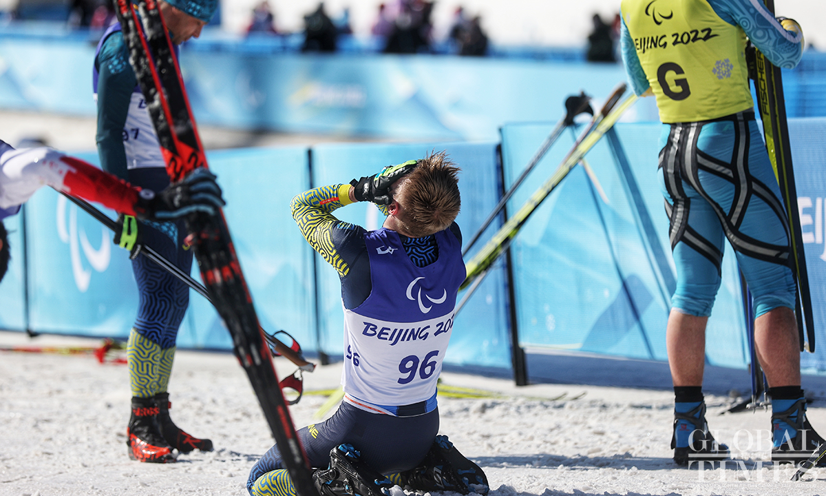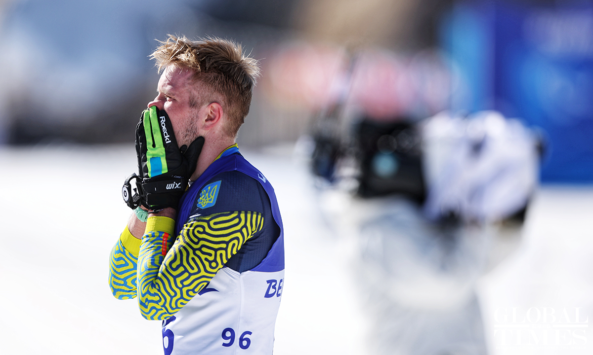 Athletes from Ukraine swept the medals in the Para Biathlon Men's Middle Distance Vision Impaired final at the Beijing 2022 Paralympic Winter Games held in the National Biathlon Center in Zhangjiakou, north China's Hebei Province, on March 8, 2022. Photos: Cui Meng/GT