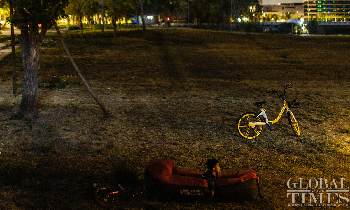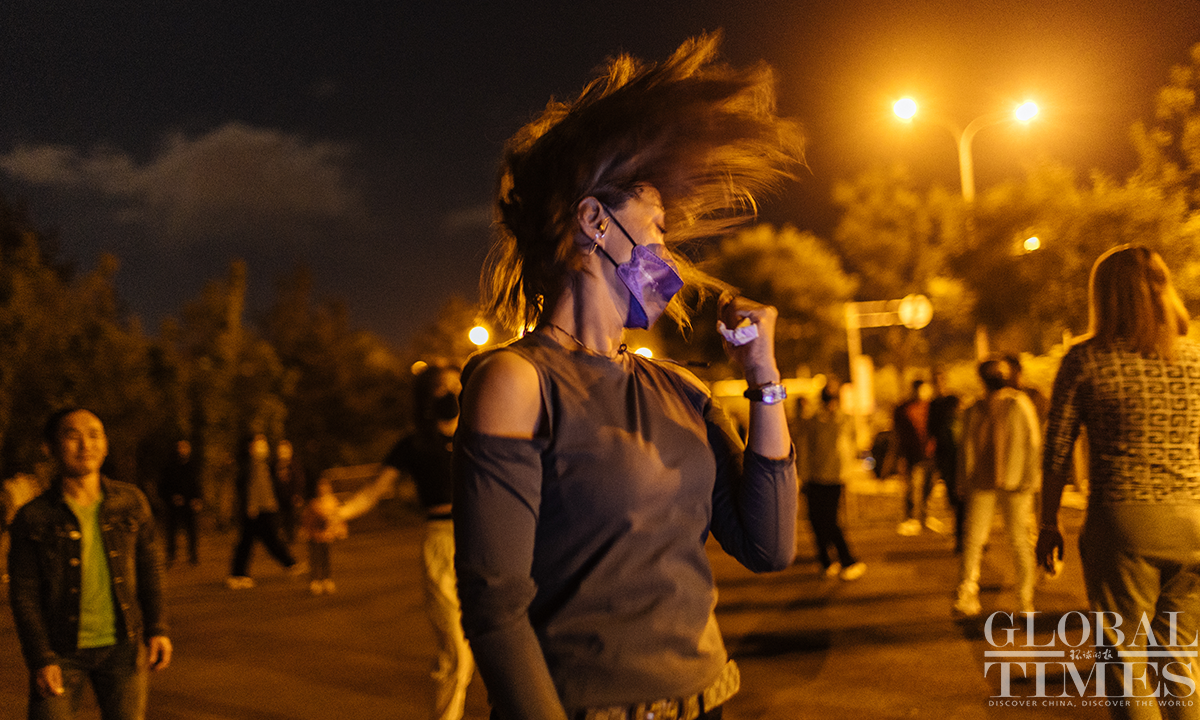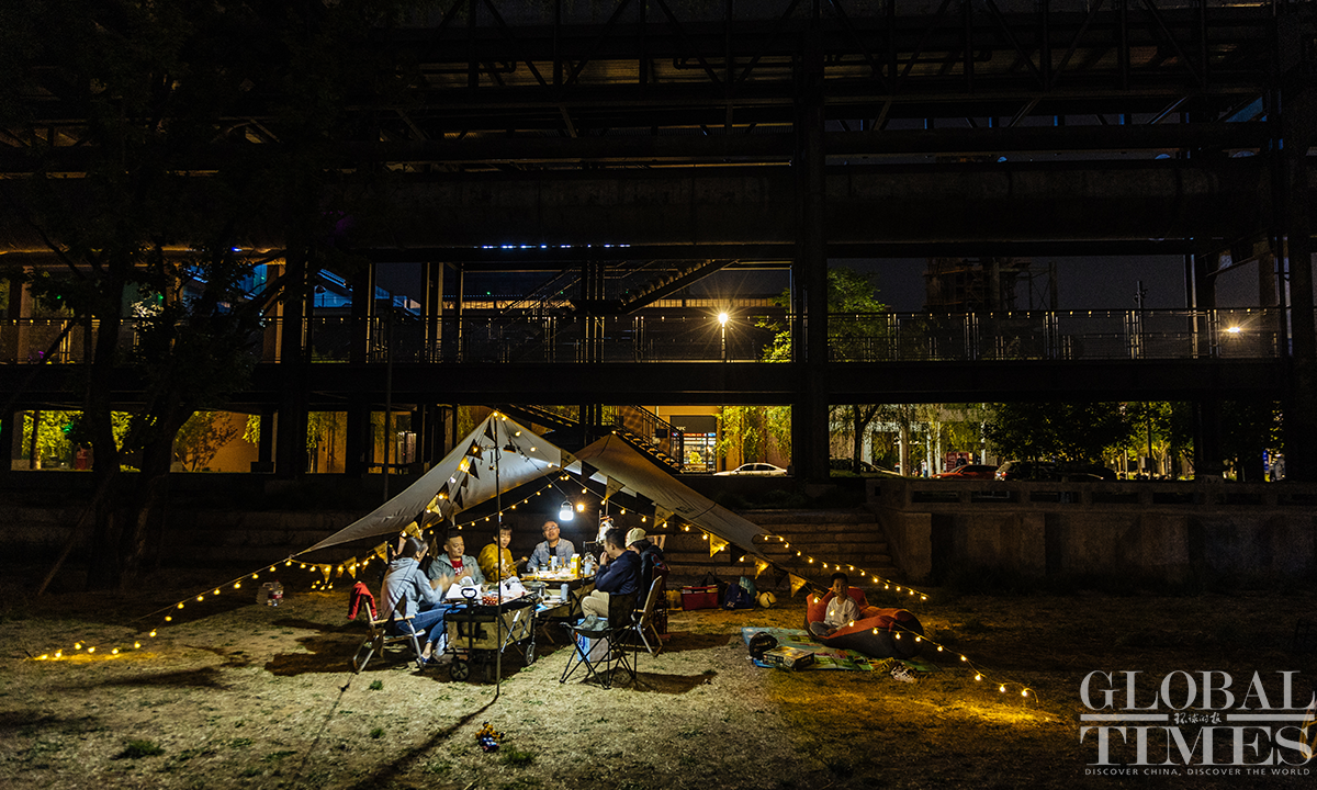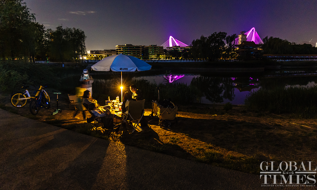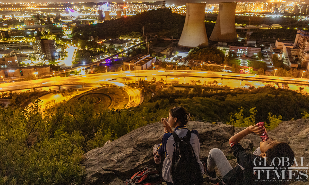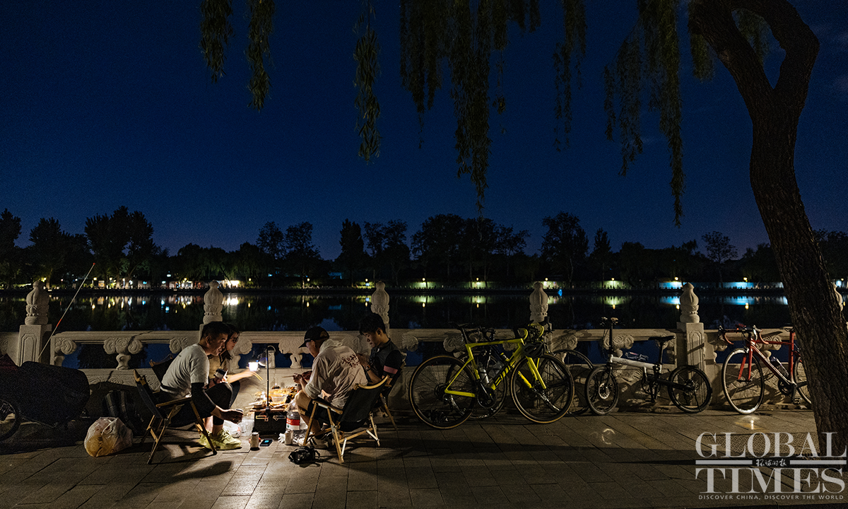 Although Beijing has suspended service in restaurants and many scenic spots as part of the epidemic prevention and control measures, people are going out to enjoy the good weather while abiding by anti-epidemic regulations. At the Shougang Park, people set up tents, have picnics and participate in outdoor sports. People in the Gulou area still exercise in the evening. An endless stream of people go to Houhai for a walk while many climb the Hongguang Mountain to take pictures of Beijing's night view. The city is still bustling with energy. (Photos: Li Hao/GT)