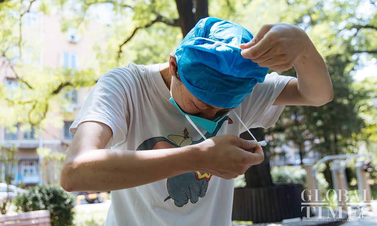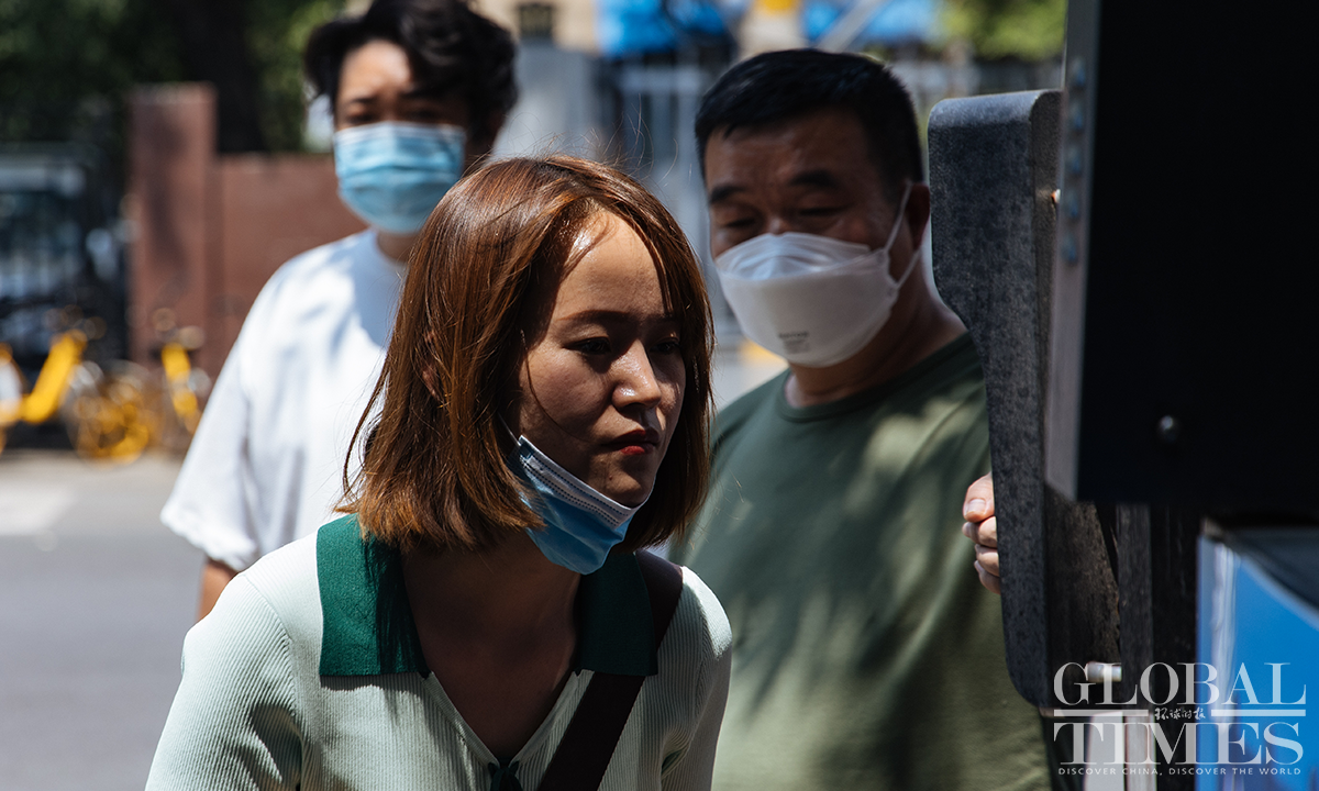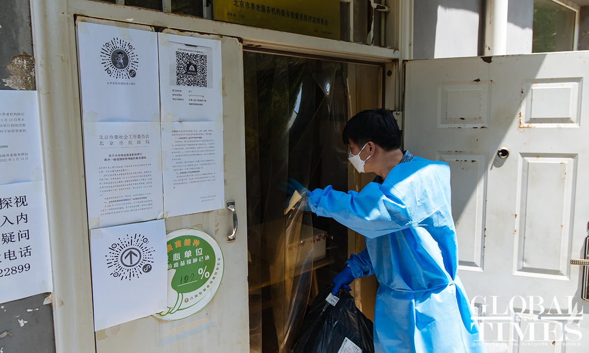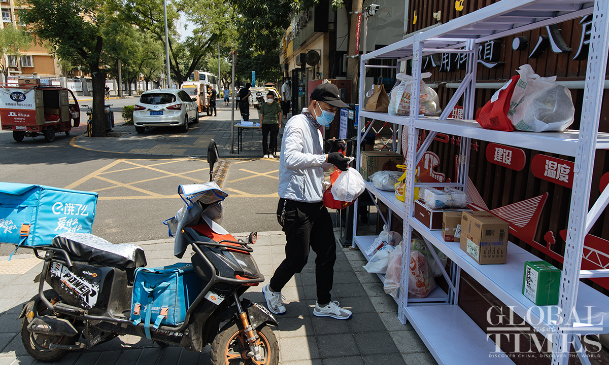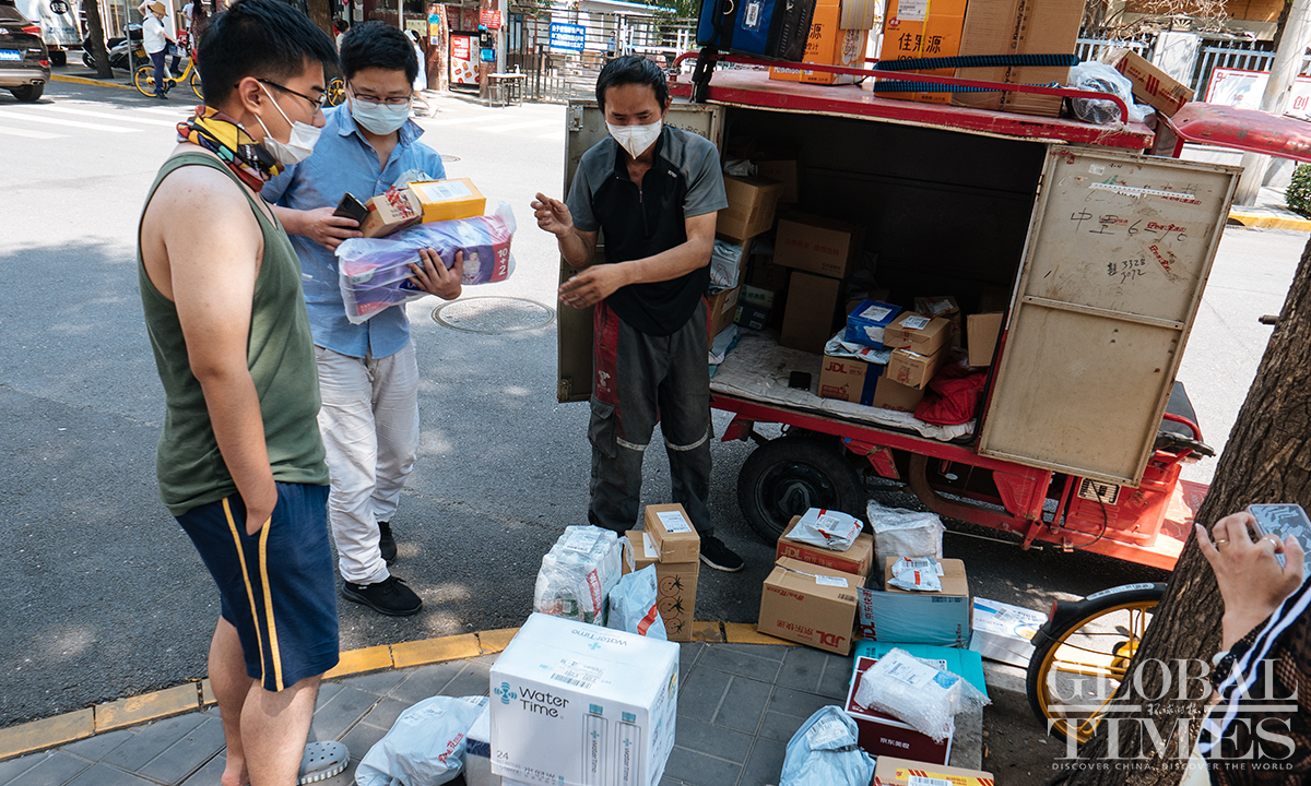 Multiple districts in Beijing have upgraded anti-epidemic measures, strengthened community prevention and control management, and normalized localized nucleic acid testing. Some communities have arranged 24-hour security personnel at the residential compound entrances, reinforcing management of people and vehicles’ access, temperature check, health code scanning, 48-hour negative nucleic acid test result, registration and other measures. People from outside the community, including delivery workers, are not allowed to enter, and residents can pick up their packages in a safe and organized way. (Photos: Li Hao/GT)