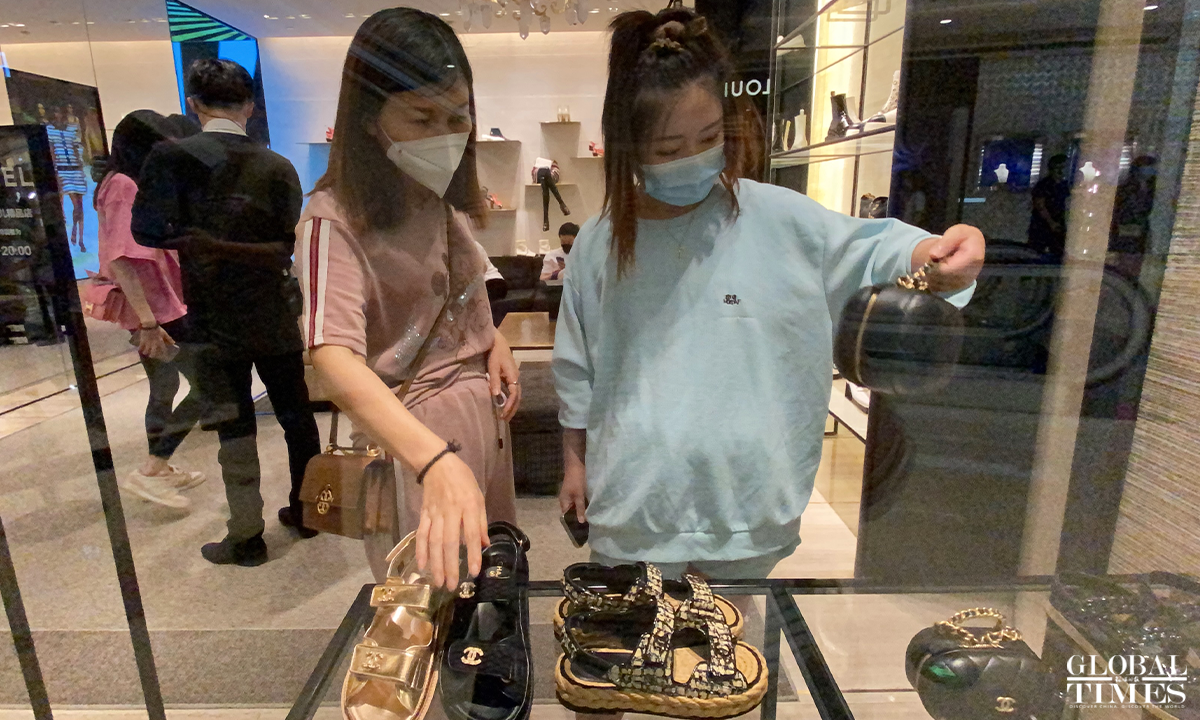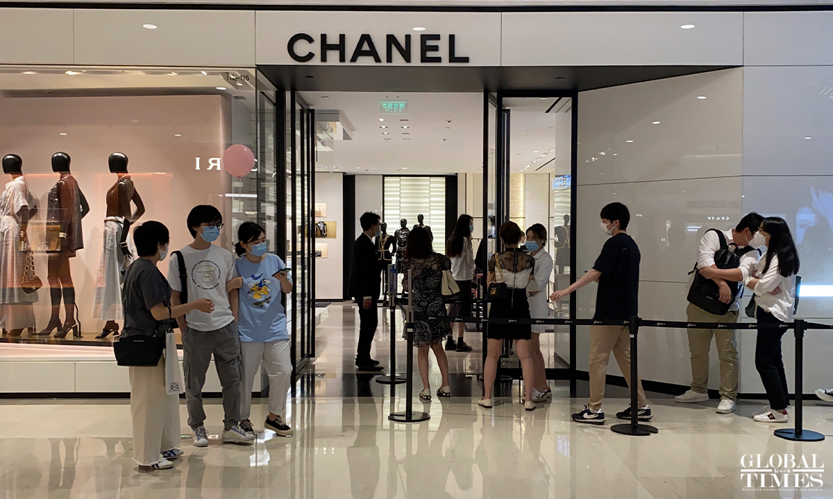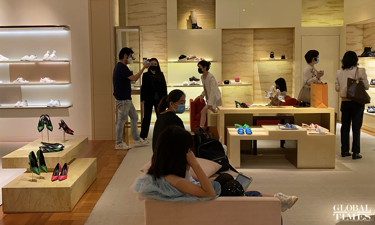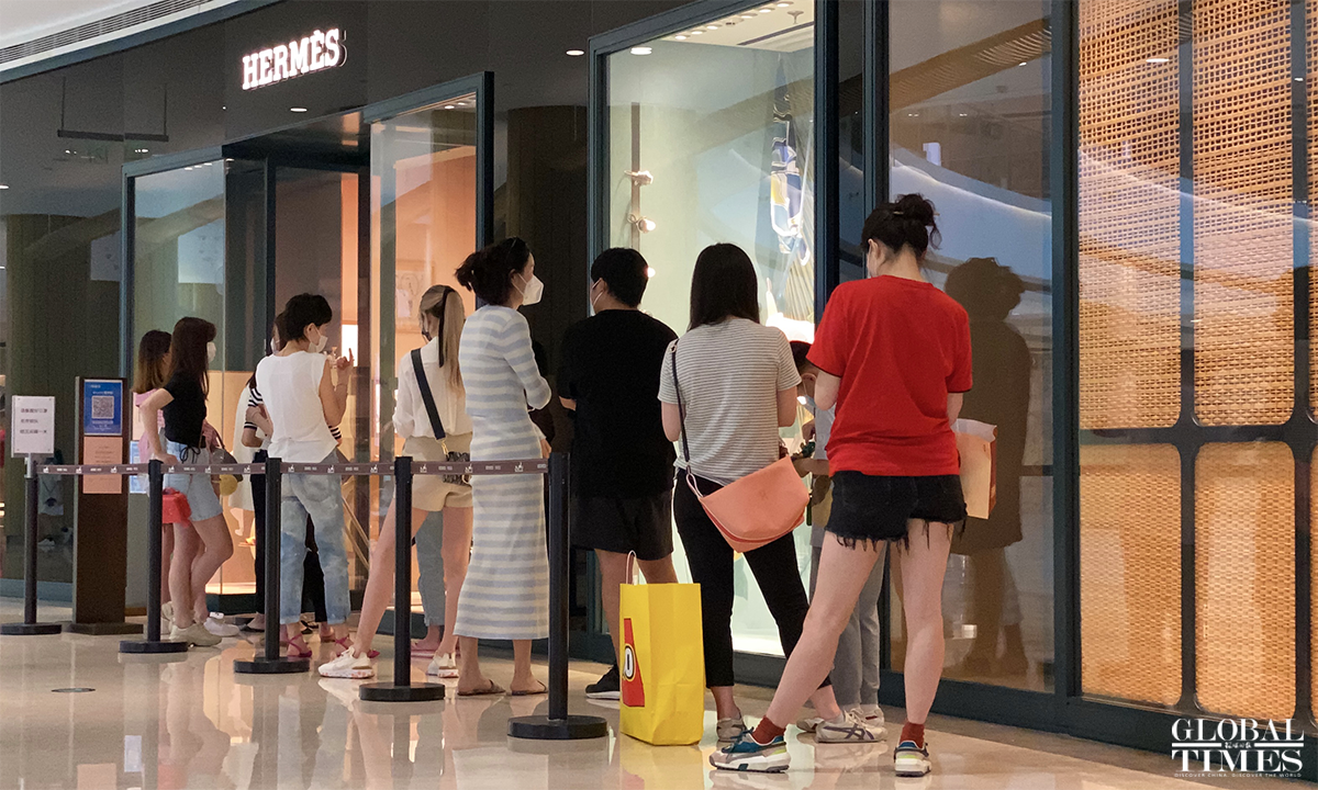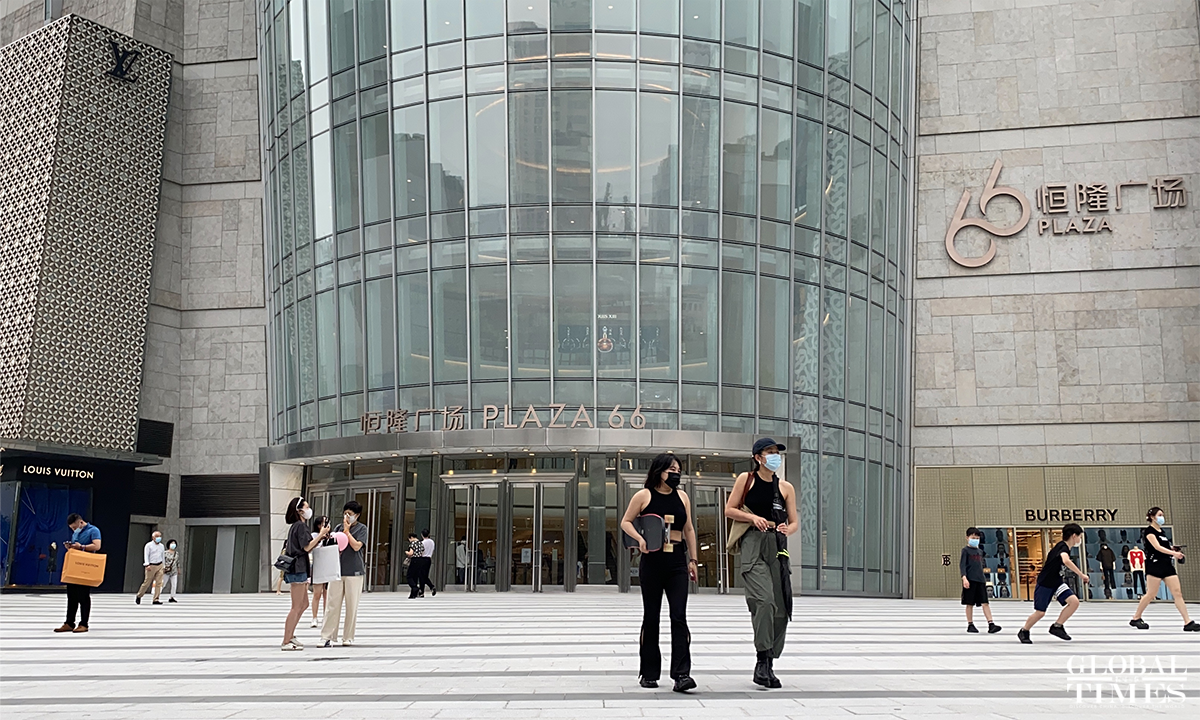 The Plaza 66 shopping mall on Nanjing road in Shanghai resumed business on June 1. The flow of people has increased and there are long queues in front of some luxury stores. Photo: Chen Xia/GT figcaption >