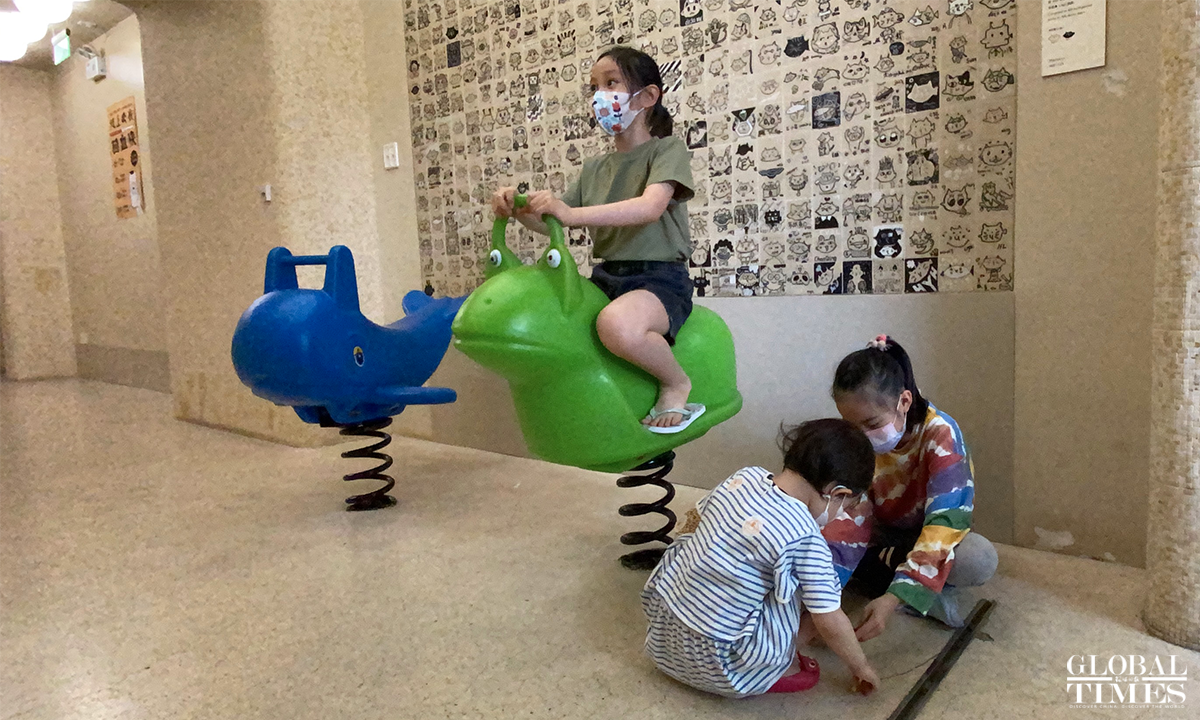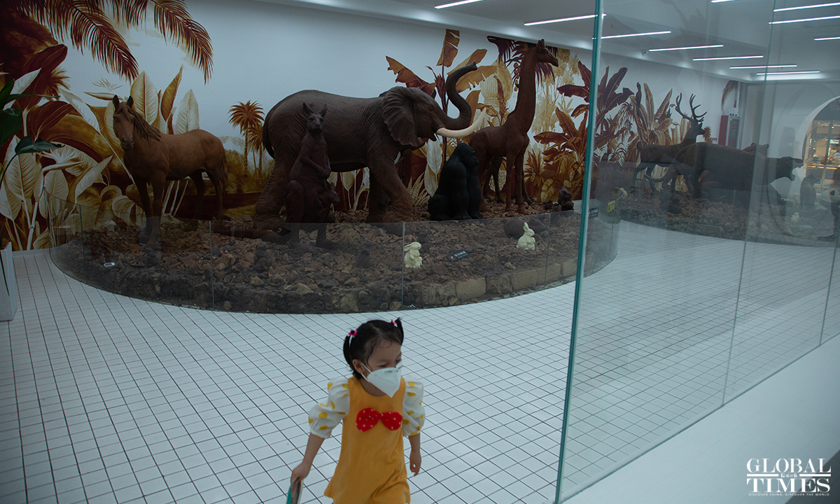 A little girl walks out of a chocolate-themed store on June 1, International Children's Day and also the first day for Shanghai to resume production and normal life. The animals in the store are made from chocolate. Photo: Wu Shiliu/GT figcaption >