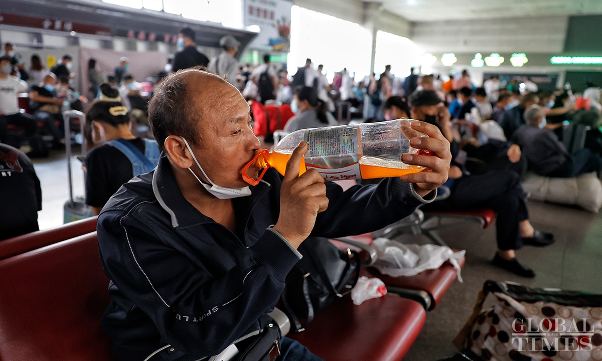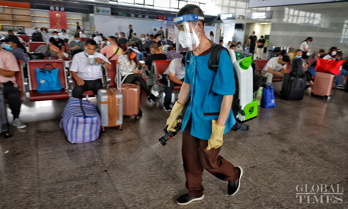 At Beijing West Railway Station, public areas including waiting halls are being sanitized every two hours, and key areas such as gates, handrails and service desks, are sanitized twice every hour. Photos: Li Hao/GT