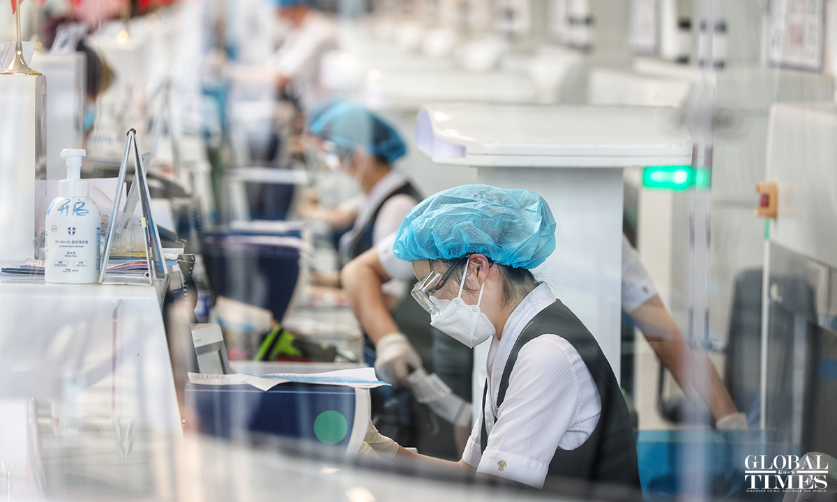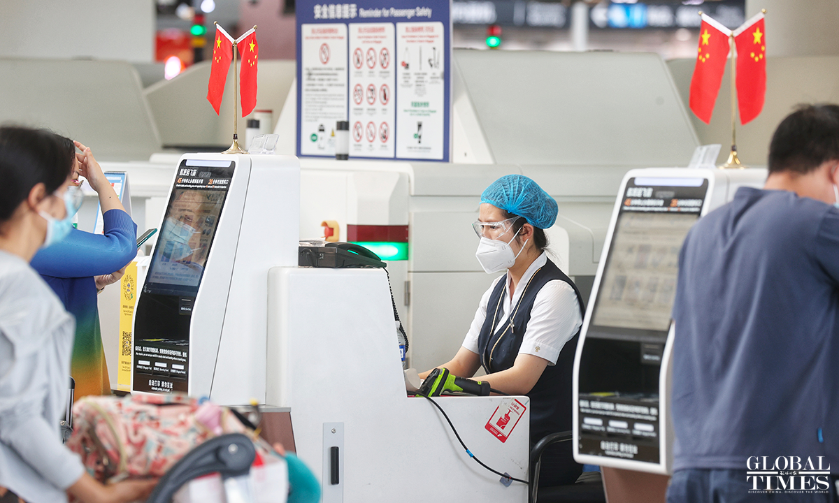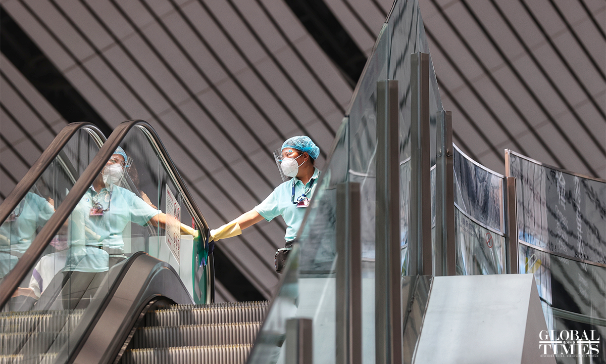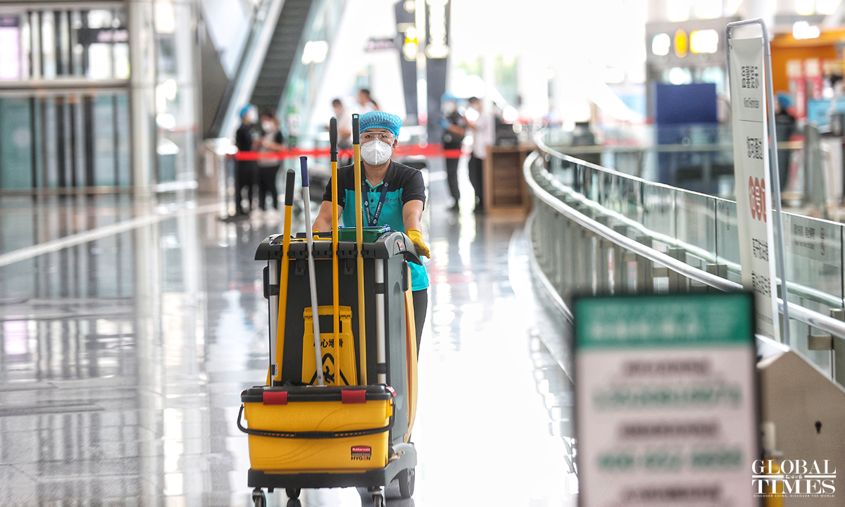 The 24-hour nucleic acid detection point has been set up within the airport and at the same time, the terminal staff insisted on taking personal protective measures and on regularly disinfecting key areas and points including escalator handrails and luggage carts to ensure the safety of passengers. Photos: Cui Meng/GT