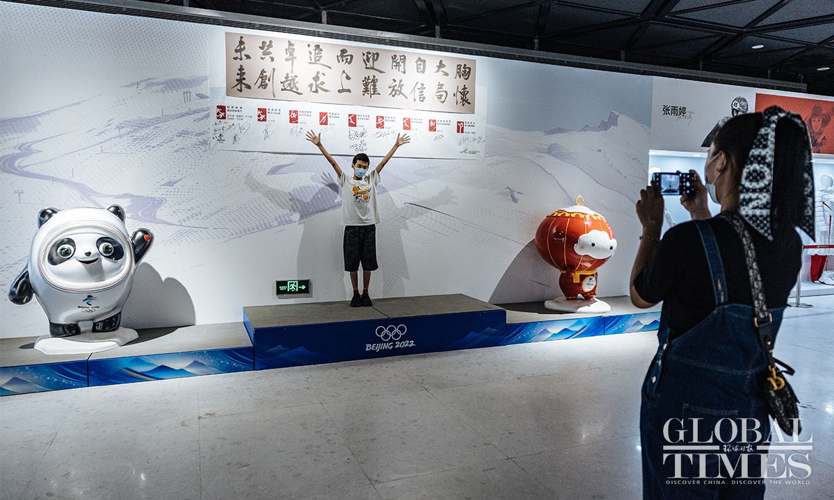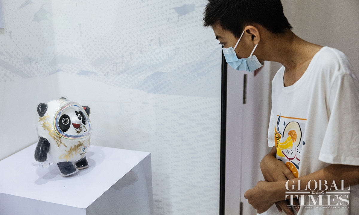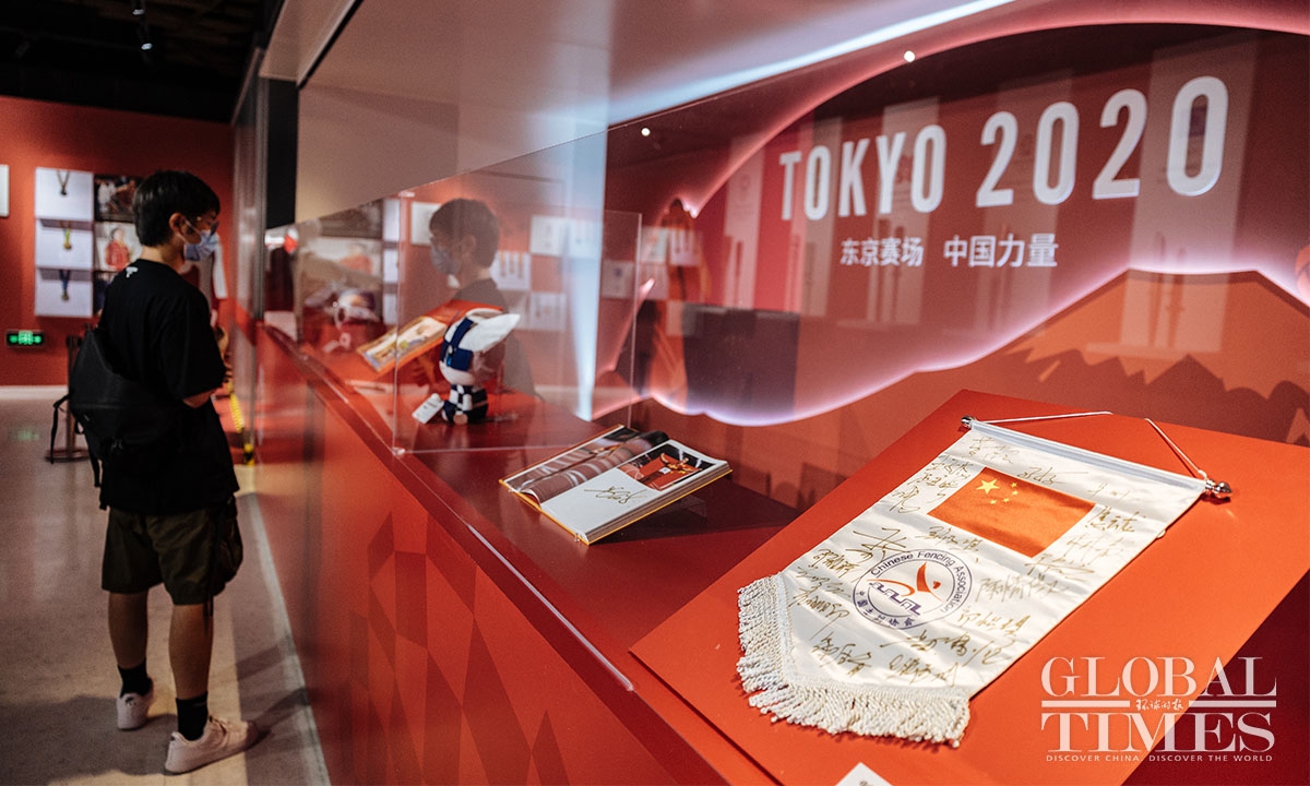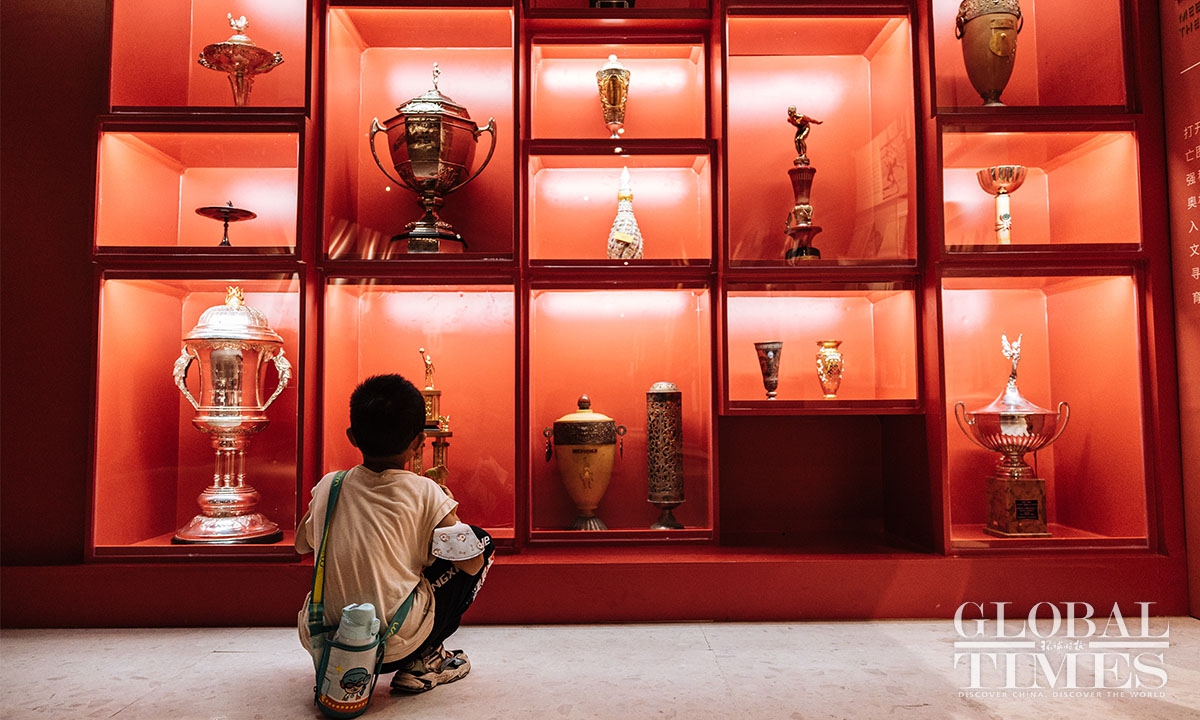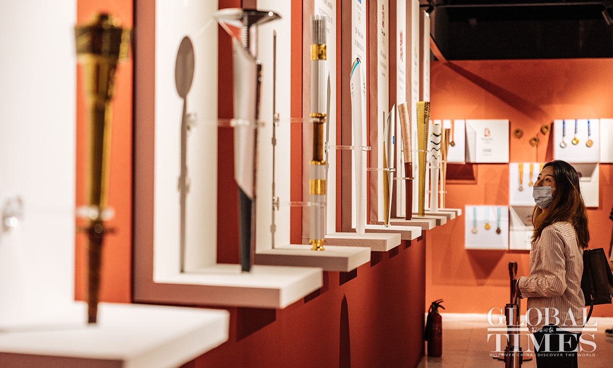 Nearly 500 items from the China Sports Museum, including autographed sportswear of Chinese champions of the Beijing 2022 Winter Olympic Games, Olympic flame torches, medals and the Golden Bing Dwen Dwen are on display.