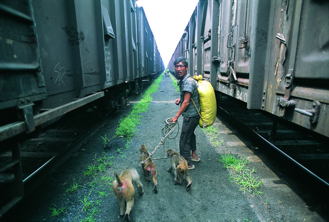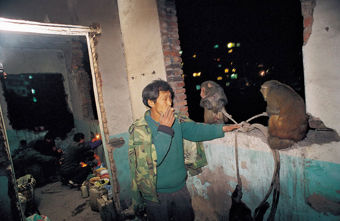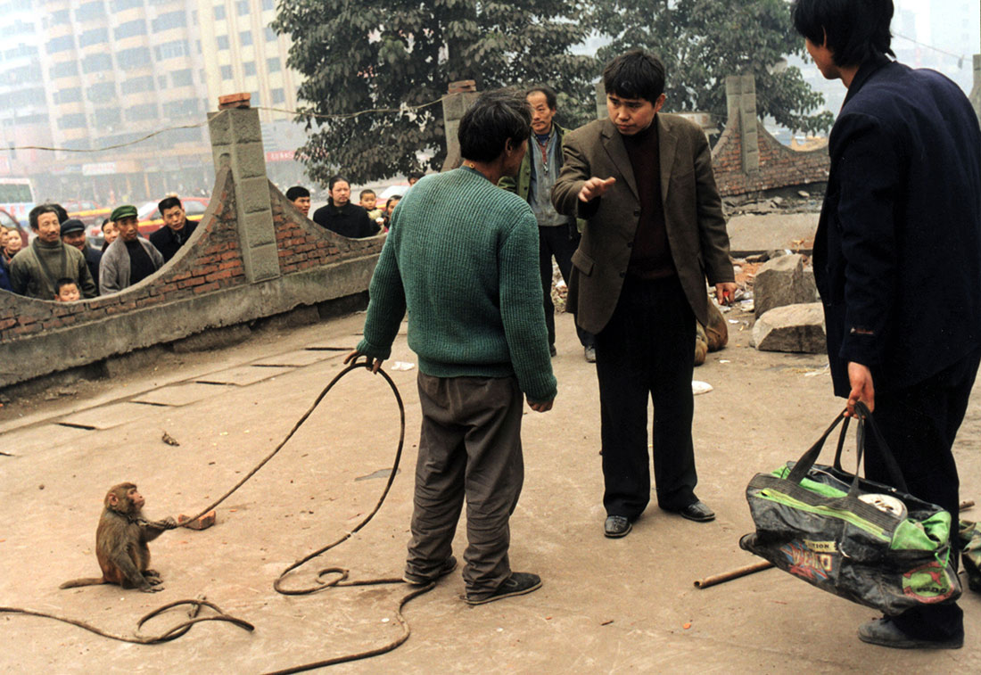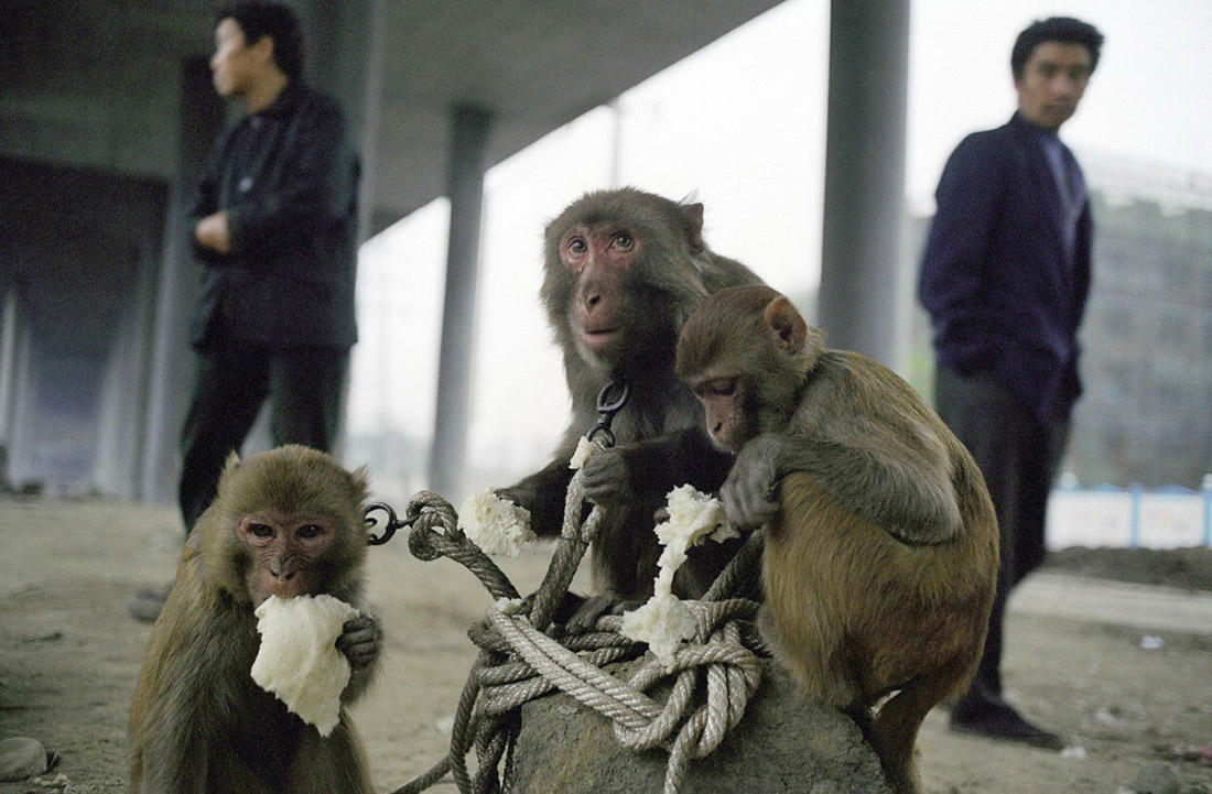 Monkey buskers wait outside the Xiangfan Railway Station in Central China’s Hubei Province to hop a train to Chengdu, Sichuan Province in October 2002. Monkey buskers often sneak on trains to save money. figcaption >