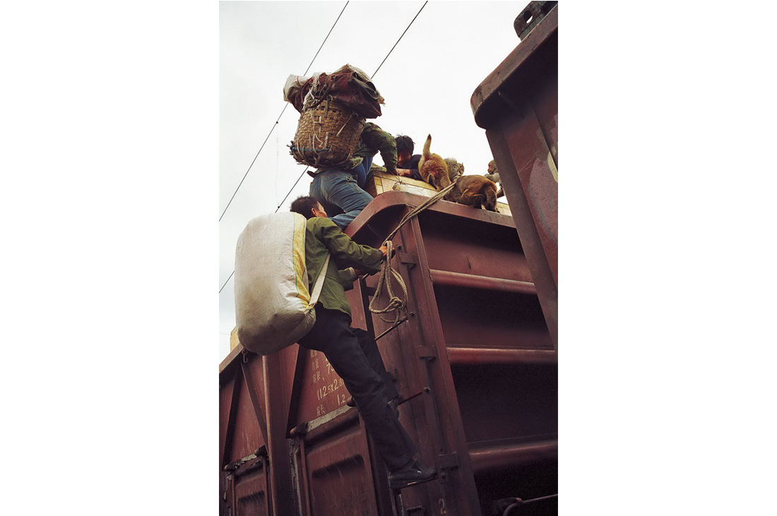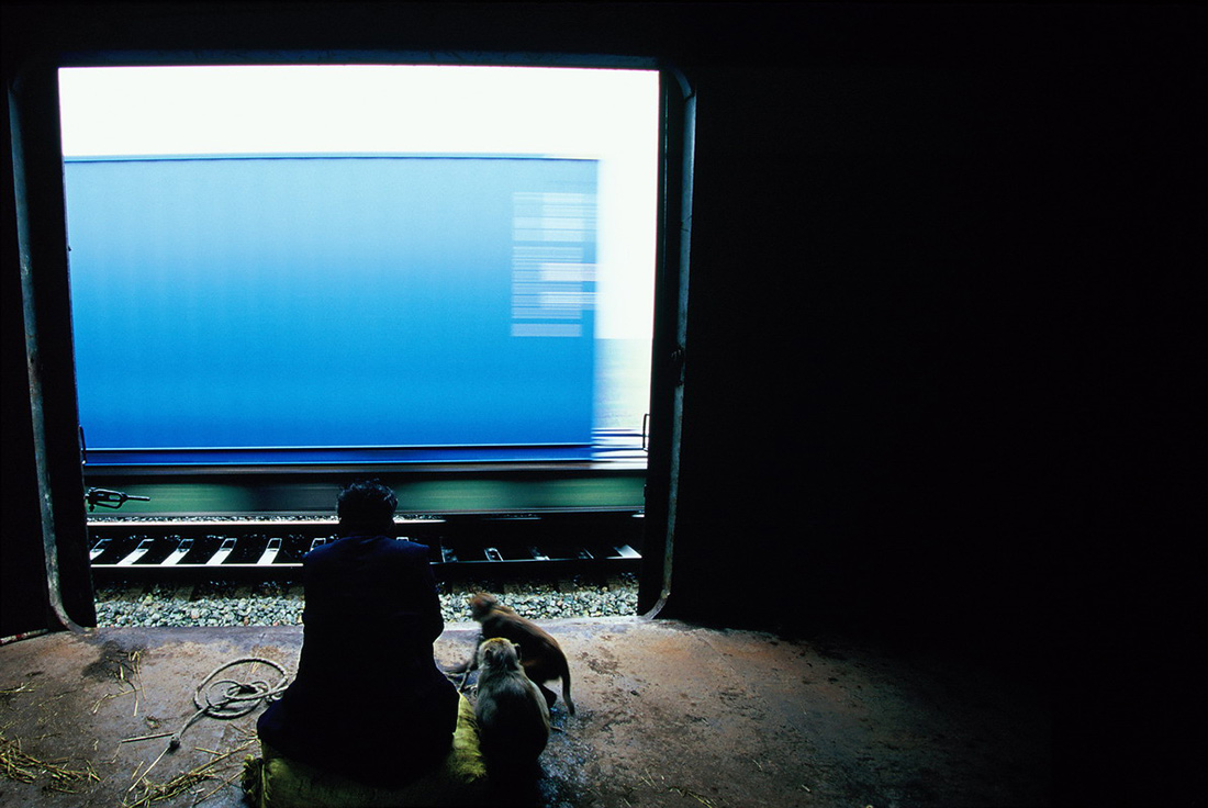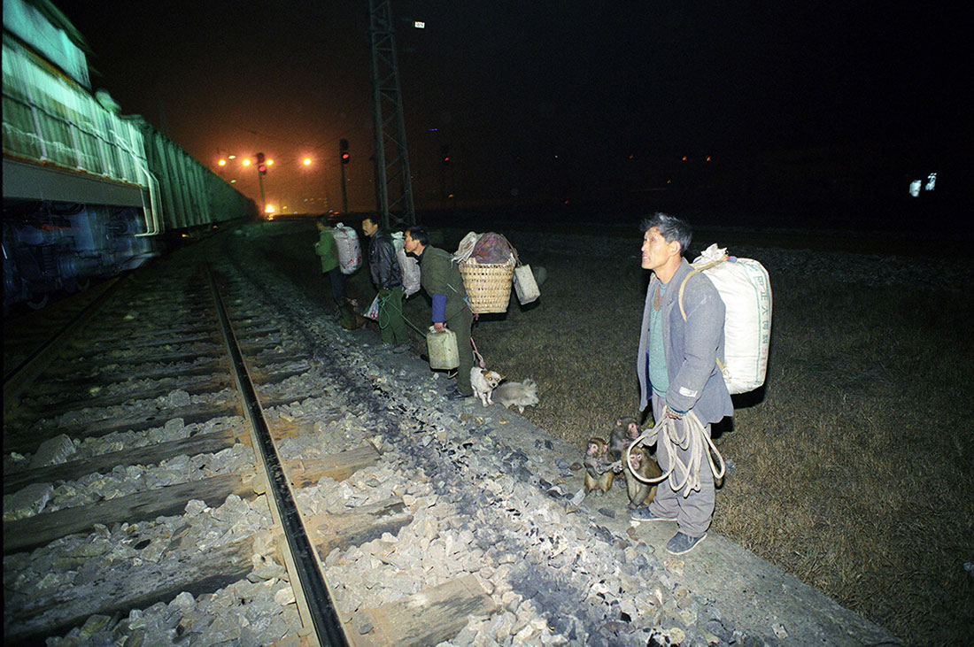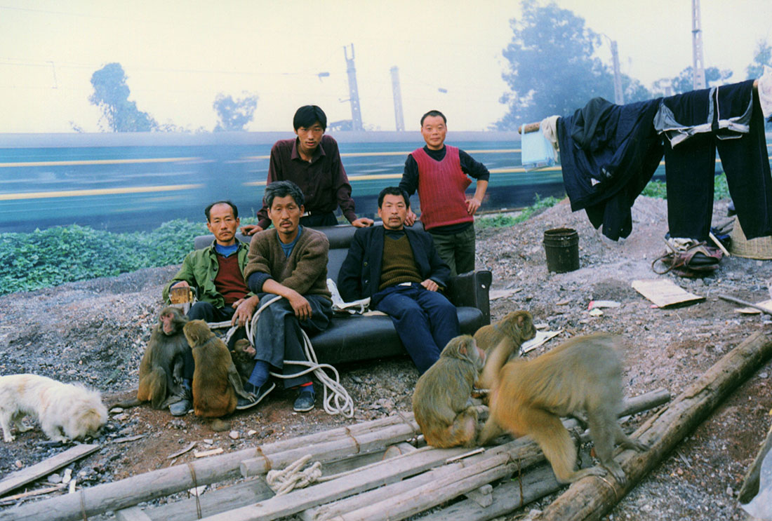 Monkey buskers wait outside the Xiangfan Railway Station in Central China’s Hubei Province to hop a train to Chengdu, Sichuan Province in October 2002. Monkey buskers often sneak on trains to save money. figcaption >