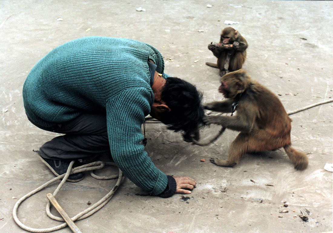 Four monkey buskers were detained in July 2014 when performing with six trained monkeys on the streets of Mudanjiang city in Northeast China’s Heilongjiang Province, because they did not have a wildlife transportation license.